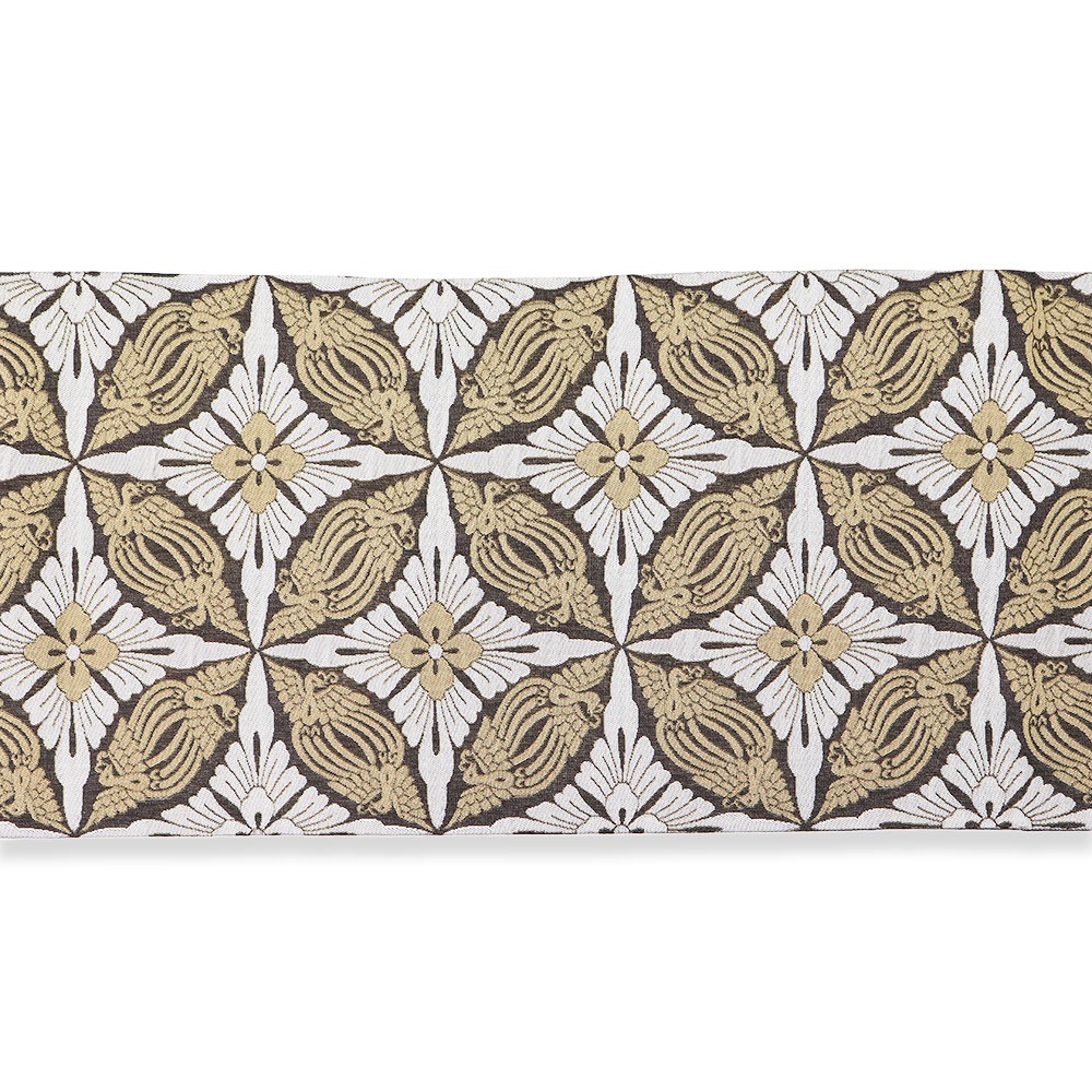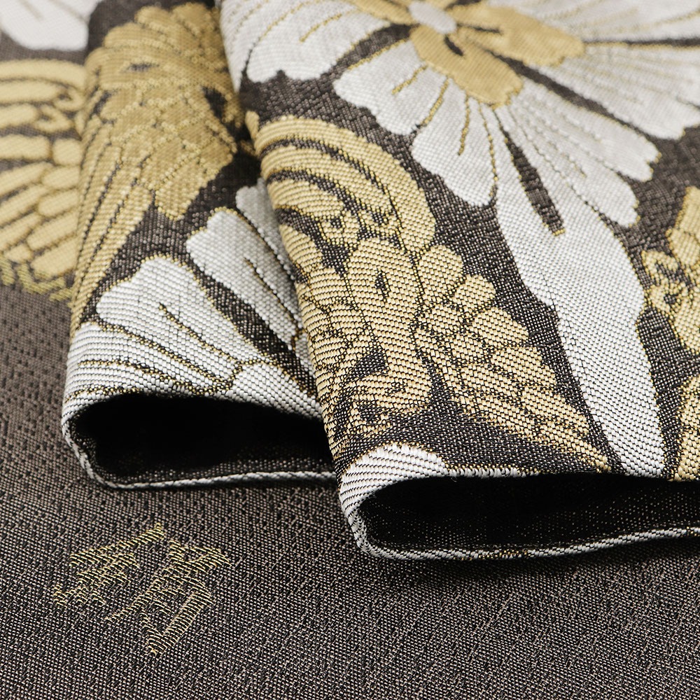 しっかりとした打ち込みの帯地に、七宝花菱を織り上げた一本です。深みのある茶色をベースに、白と金で織り上げられた柄行きは華やかさと格調高さを演出。柄行き、色彩、織の技術、どれをとっても西陣の老舗【となみ織物】ならでは仕上がりになっています。