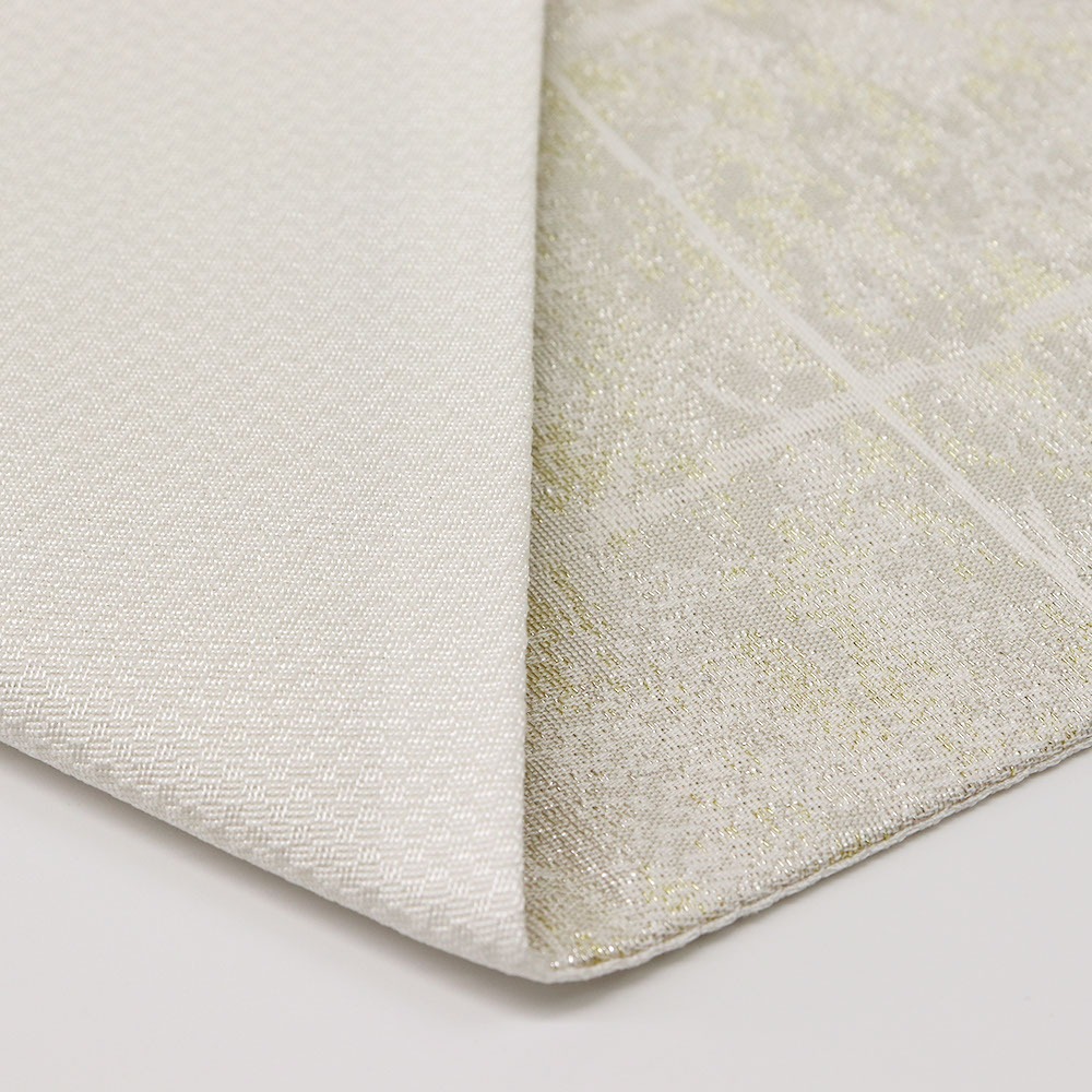軽やかな風合いと締めやすさが特徴の一本。白色を基調に黄色と箔糸の格子模様がモダンで華やかな印象です。王道の格子とニュアンス感のある織り上がりでながくお使いいただけ、コーディネートや合わせる帯小物によって主役にも名脇役にもなる優れもの◎