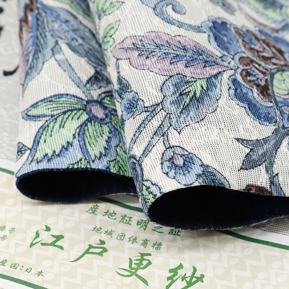 室町~桃山時代に日本へ伝わったとされる古来インド発祥の更紗を、型紙摺りという手法を得て日本独自に昇華させた江戸更紗は、異国情緒がありながらも、深みや渋みといった日本らしい侘び寂びを味わえる「和」の美が特徴です。