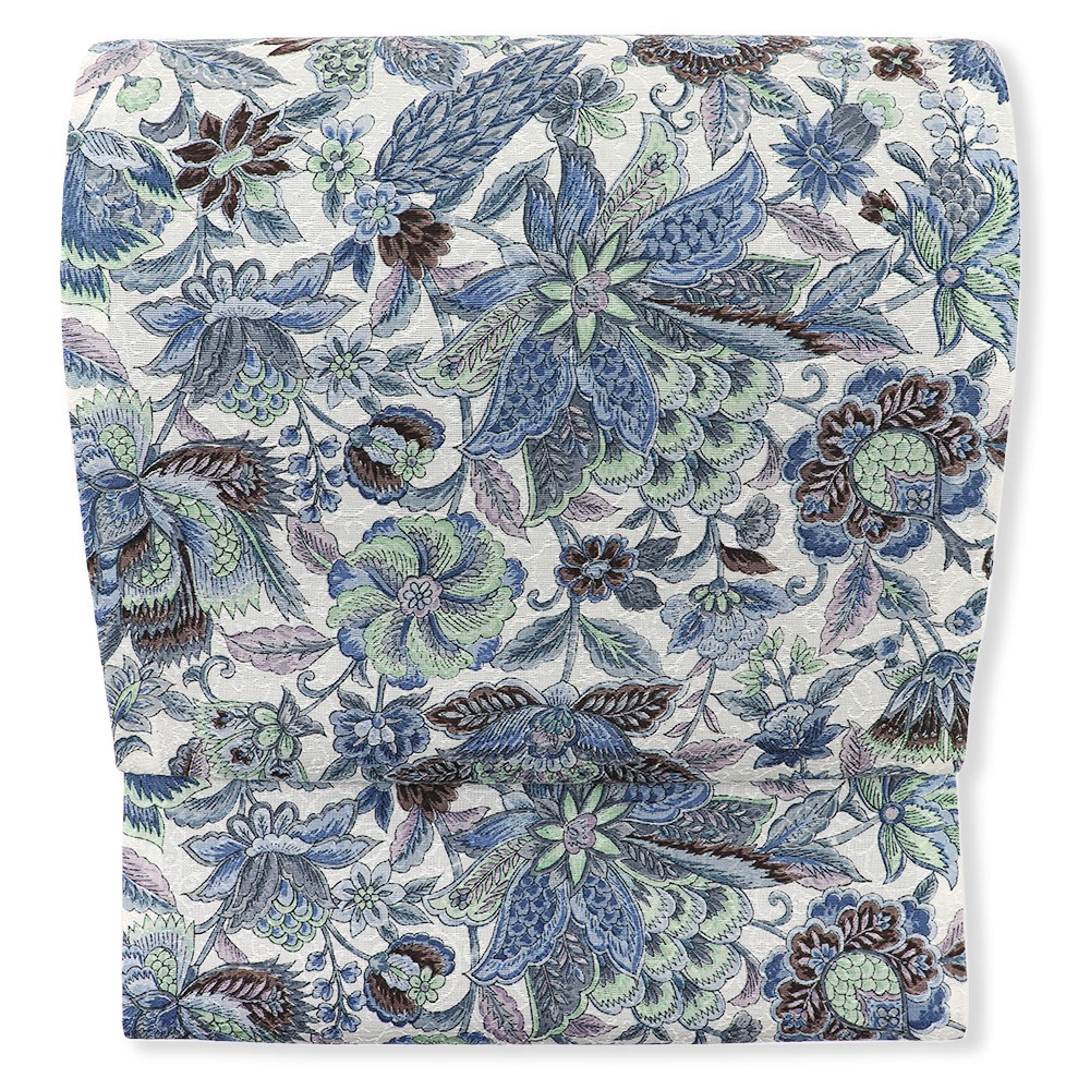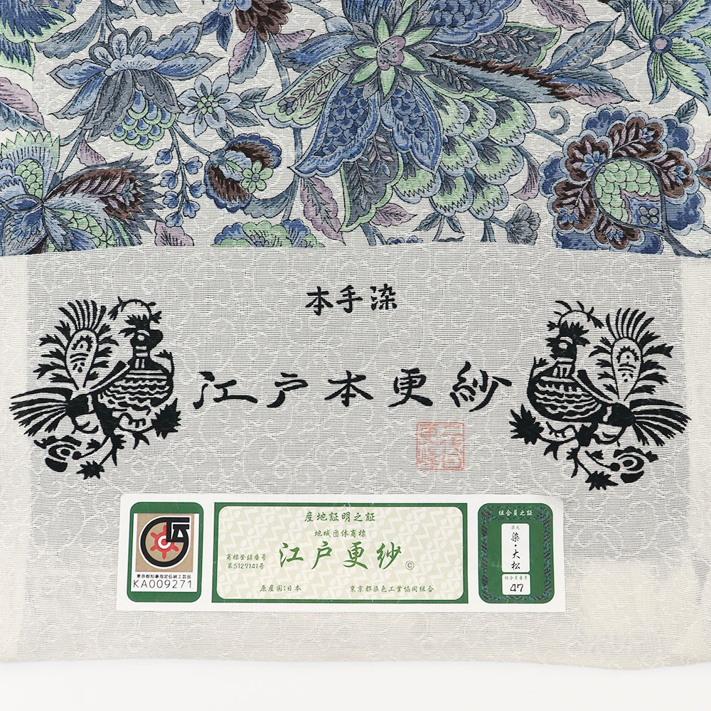 すべりの良い柔らかな地風の帯地に、丹念に手染めされた江戸更紗が広がる美麗な逸品。