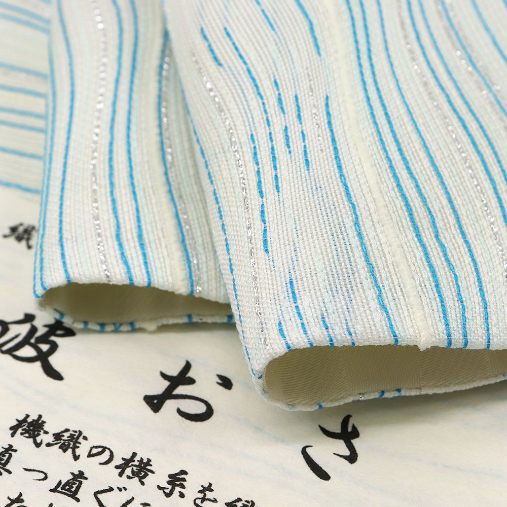 波のようによろけた織で隙間を作り奥行きを生み出す「波筬織(筬波織)」という技術で織り上げられた逸品。しなやかな曲線を描く生地には、流れるような光沢と、吸い込まれるような奥行きが生まれています。
