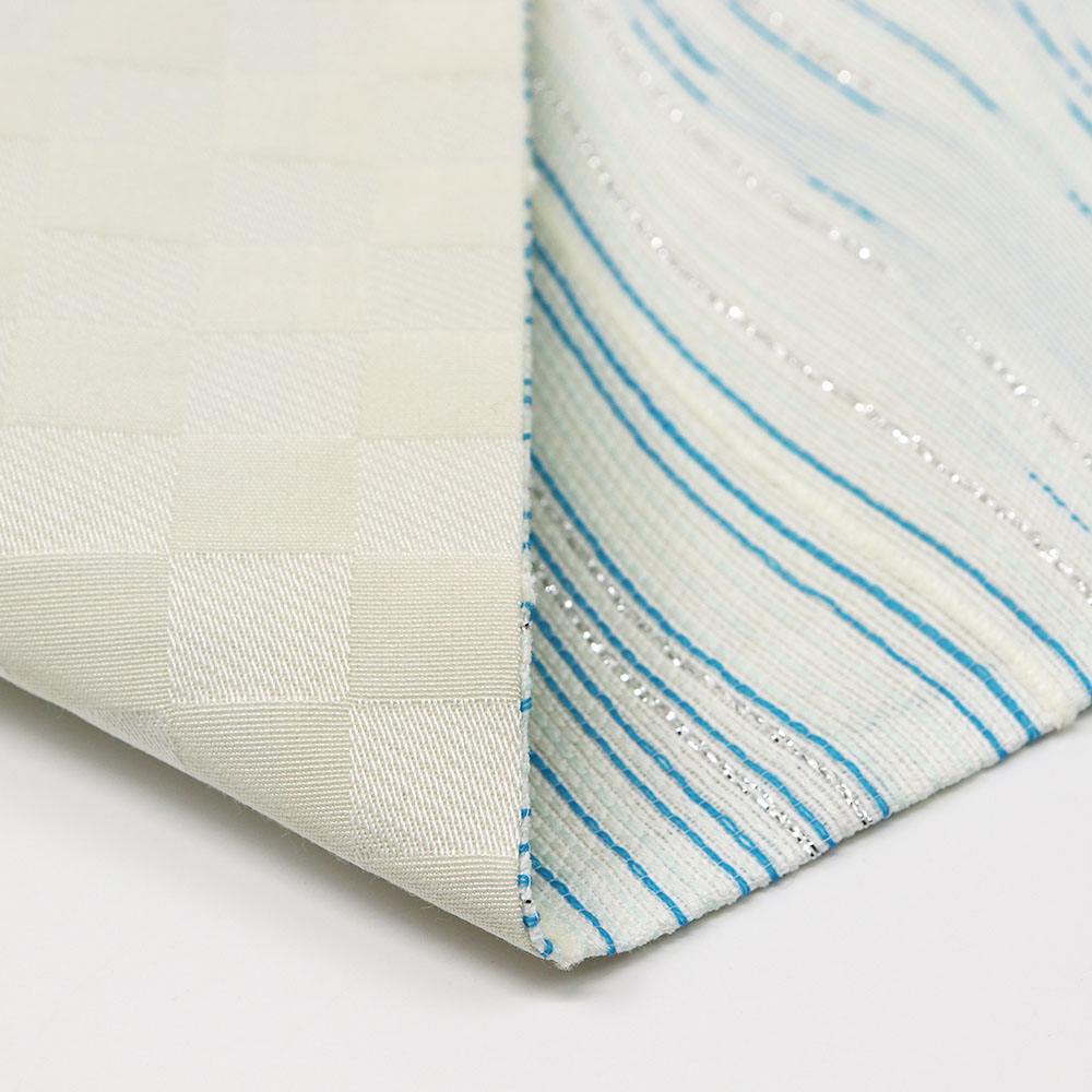水色や白、箔糸で表現された市松模様は、表情豊かな生地感と相まってグラフィカルで現代的な仕上がりになっています。