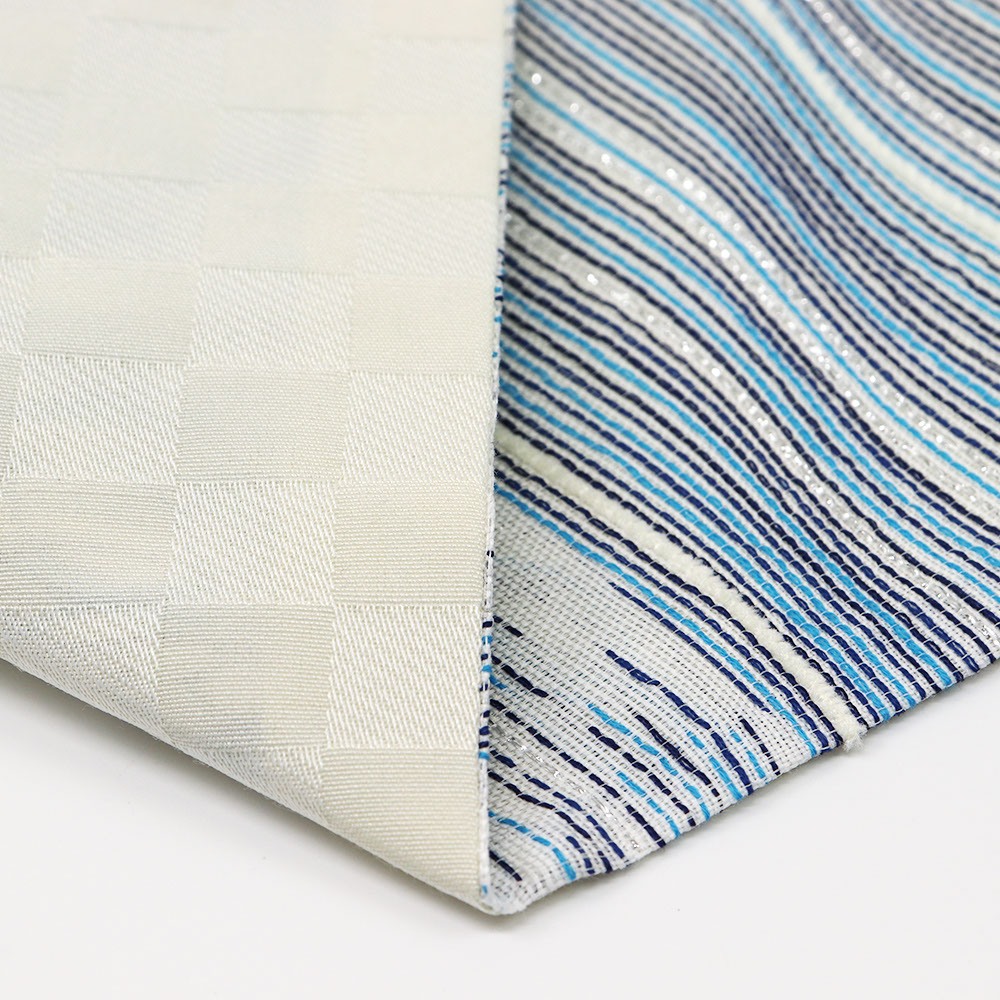青や白、箔糸で表現された市松模様は、表情豊かな生地感と相まってグラフィカルで現代的な仕上がりになっています。