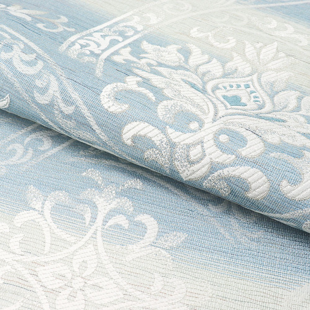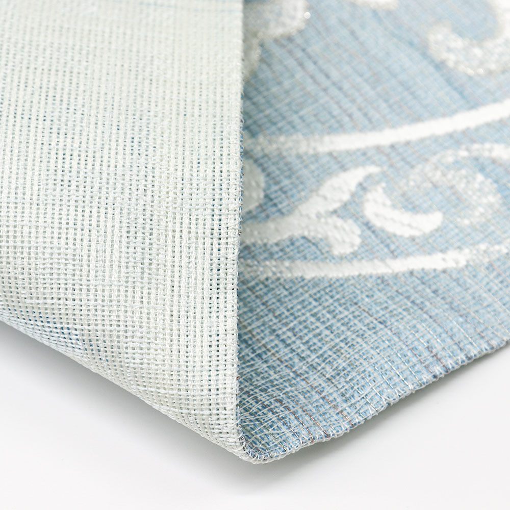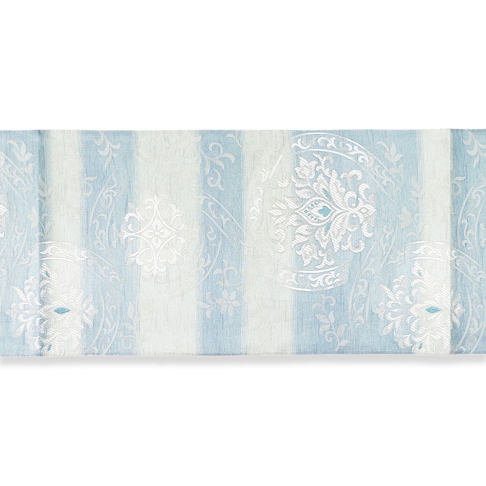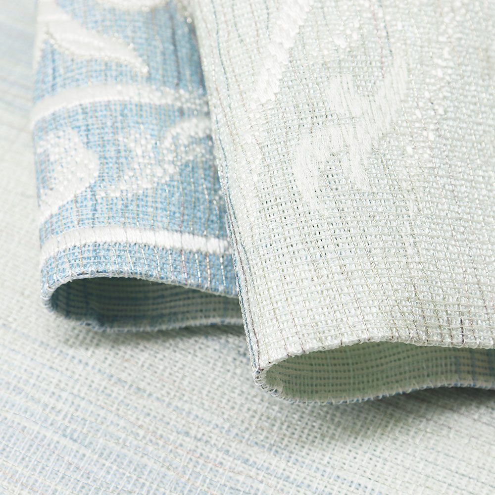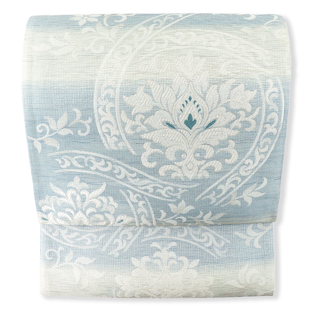大きなアラベスク華文が広がる、美しくもモダンなデザイン。全体に細く巡らせた金属糸風の上品な煌めきが、華やかさを引き立てます。柔らかくはんなりとした配色と、軽やかな風合いで単衣の季節にもオススメ◎