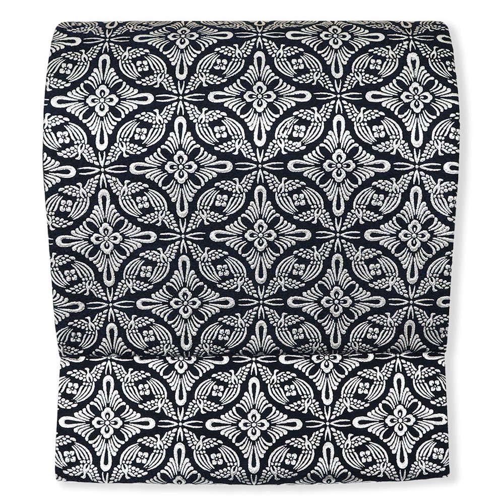 立体感のある金彩が特徴のこちらは、友禅染めと印金技術を駆使して細やかに柄付けされた重厚感のある一本。華七宝を象った銀彩の上からさらにラメを散りばめることによって、とめどない輝きがあなたの帯元に宿ります。