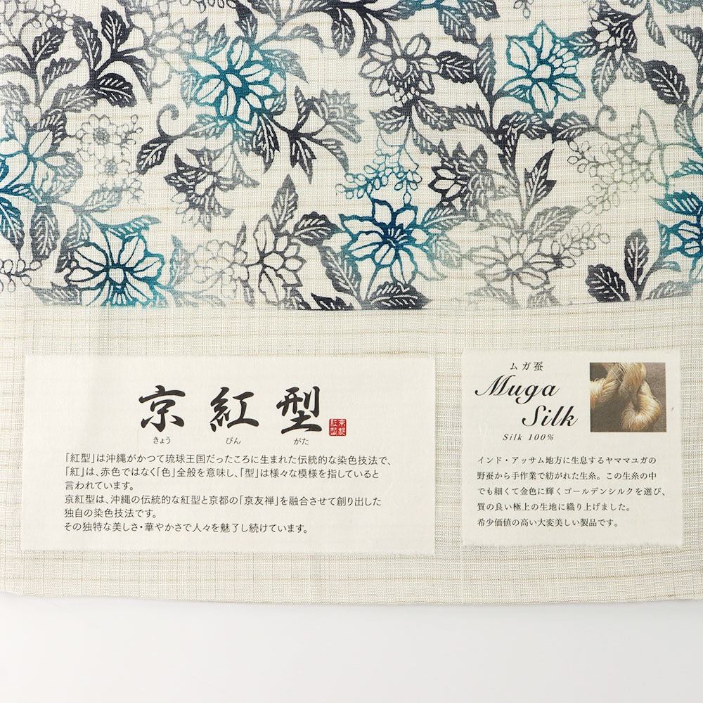 顔料を使い色鮮やかな型染を施す琉球紅型に習い、染料を使用し柔らかさをもってデザインされる京紅型。色鮮やかさを残しつつも、柔らかなデザインが着姿を優しく華やかに引き立ててくれます。