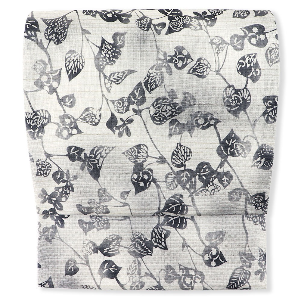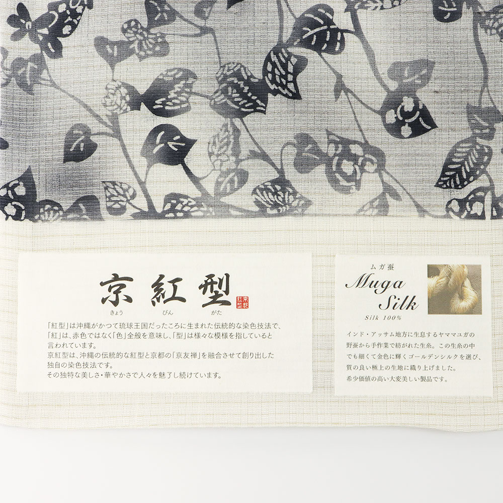 繊細な葉模様を表現した唐草の柄行きは、無地場の多い着物はもちろん、鮮やかさが控えめなので総柄や個性柄の帯にも◎ムガシルクならではの手触りも同時にお楽しみいただけます。