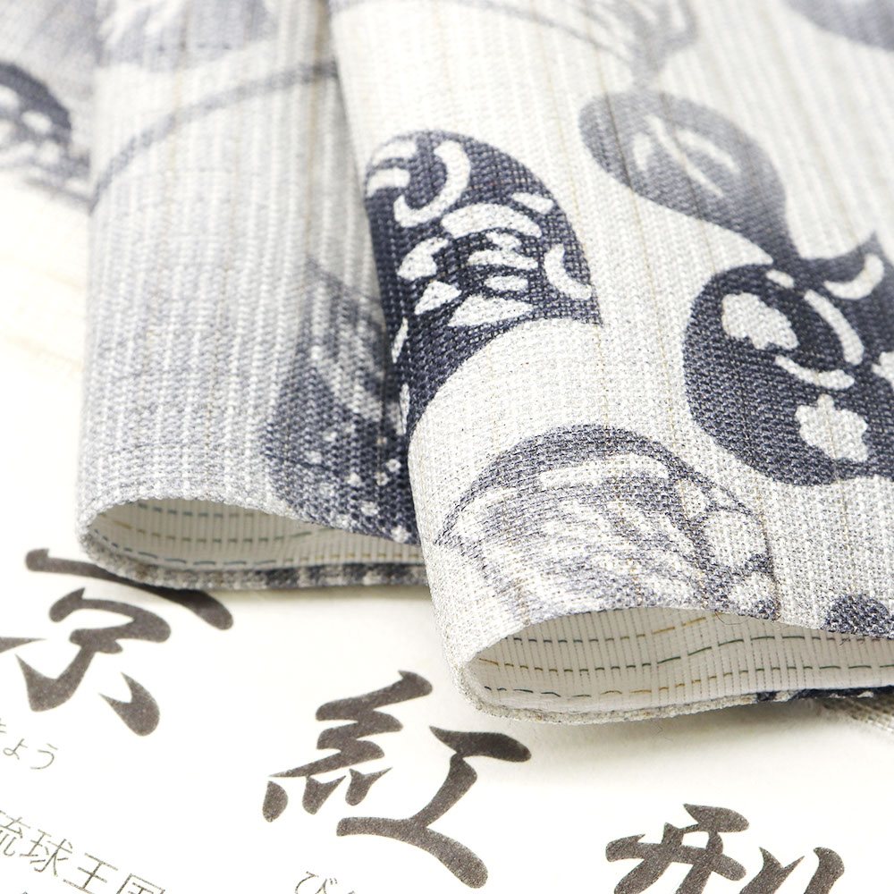 顔料を使い色鮮やかな型染を施す琉球紅型に習い、染料を使用し柔らかさをもってデザインされる京紅型。グレーの繊細な濃淡と、柔らかなデザインが着姿を優しく引き立ててくれます。