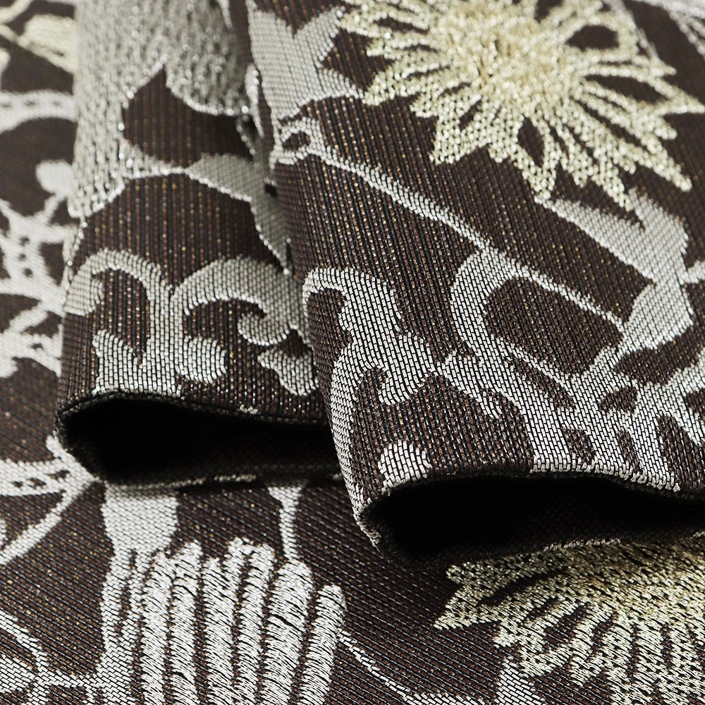 「献上取花鳥文」と名付けられたこちらの柄行きは、縦方向に柄を織り上げた献上柄デザインです。こげ茶の帯地と金糸の輝きが、重厚感と洒落感を併せ持った上品な仕上がりに。シックでハイセンスなおしゃれ帯をめざす【洛陽織物】ならではの、こだわりと美しさが全面に表現されている一本です。