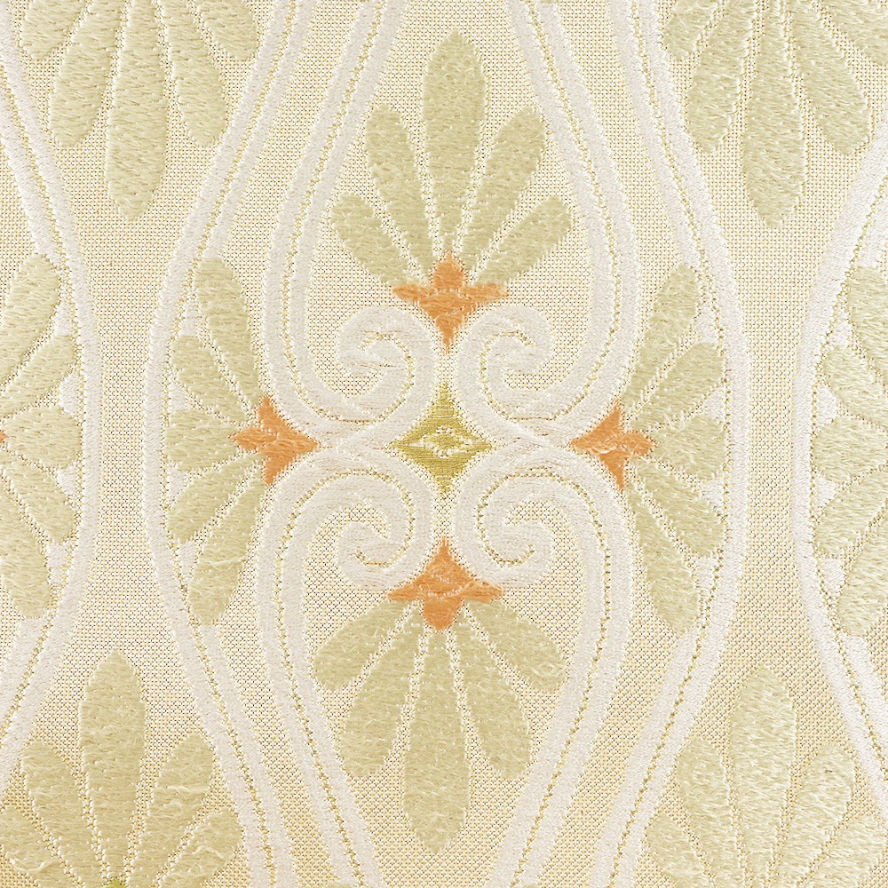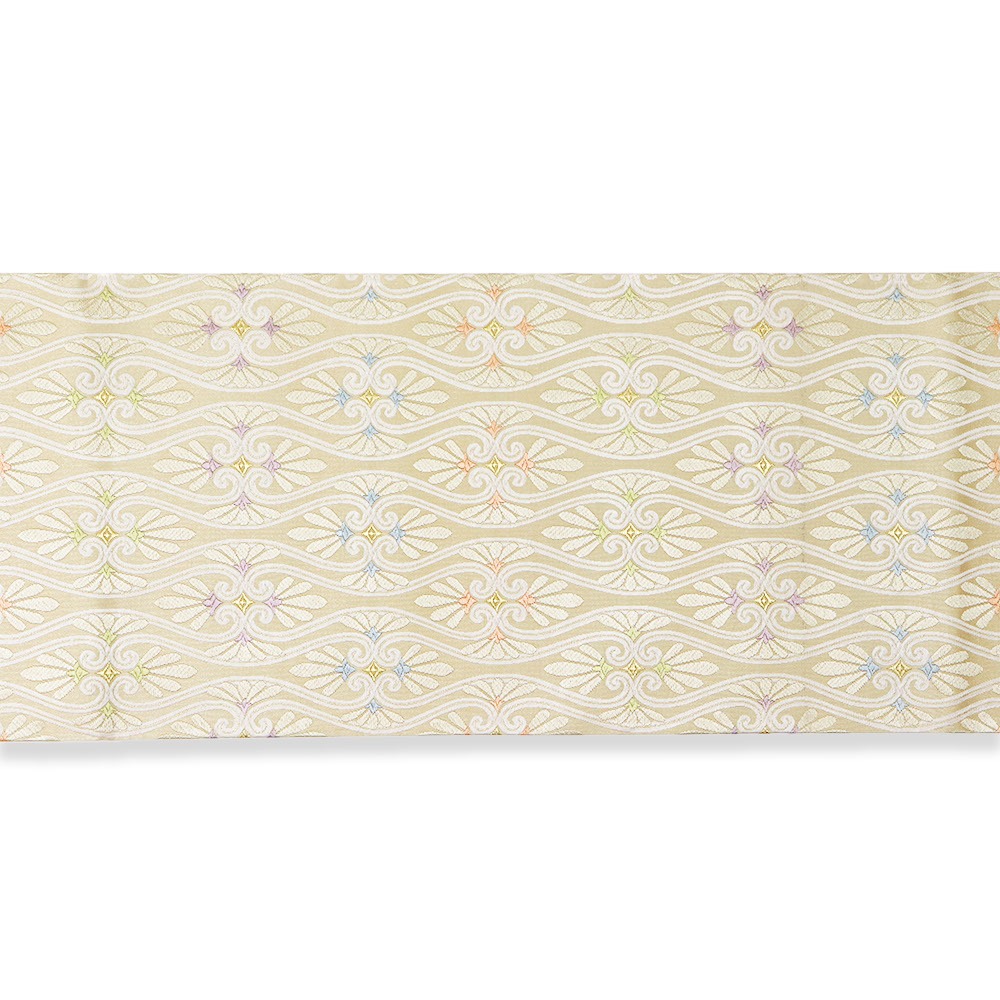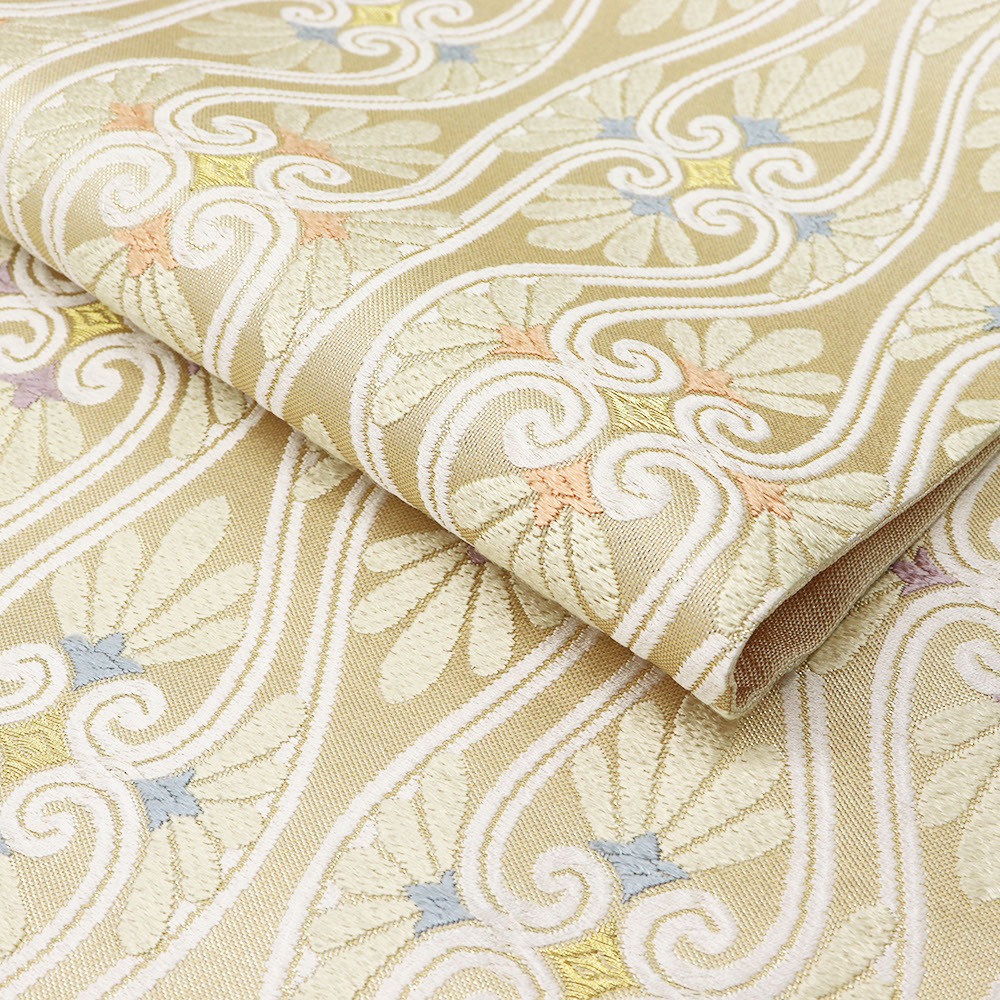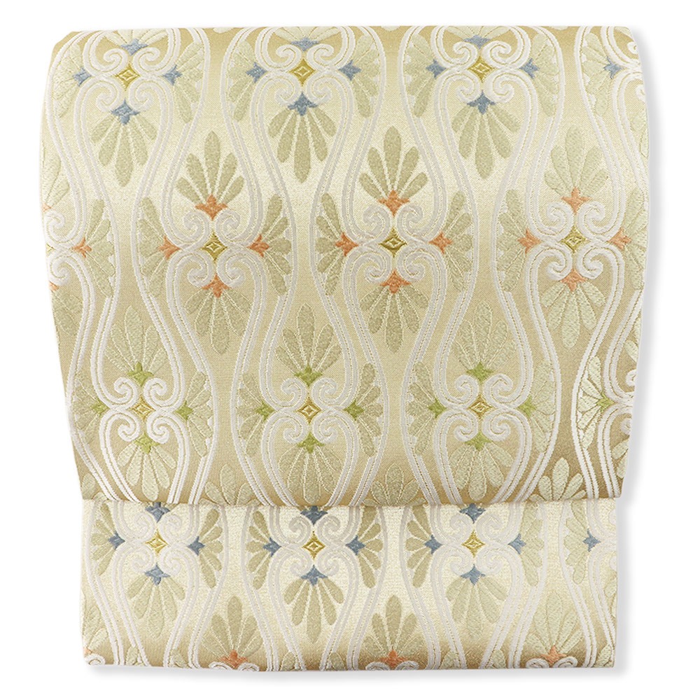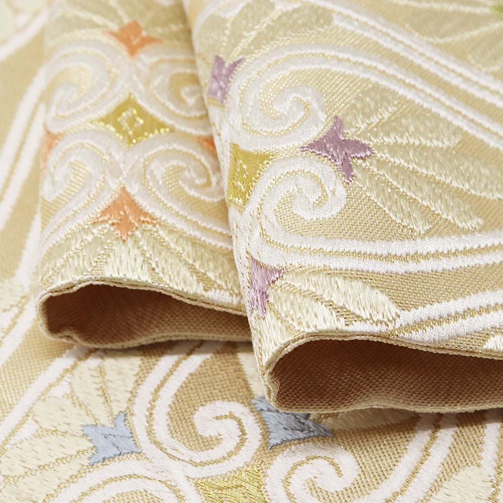 「双立枠菊華文」と名付けられたこちらの柄行きは、縦方向に伸びる菊華模様が優雅なデザインです。薄黄の帯地に金糸と鮮やかな色糸を配し、柔らかさと格調高さを演出する色使いに。シックでハイセンスなおしゃれ帯をめざす【洛陽織物】ならではの、こだわりと美しさが全面に表現されている一本です。