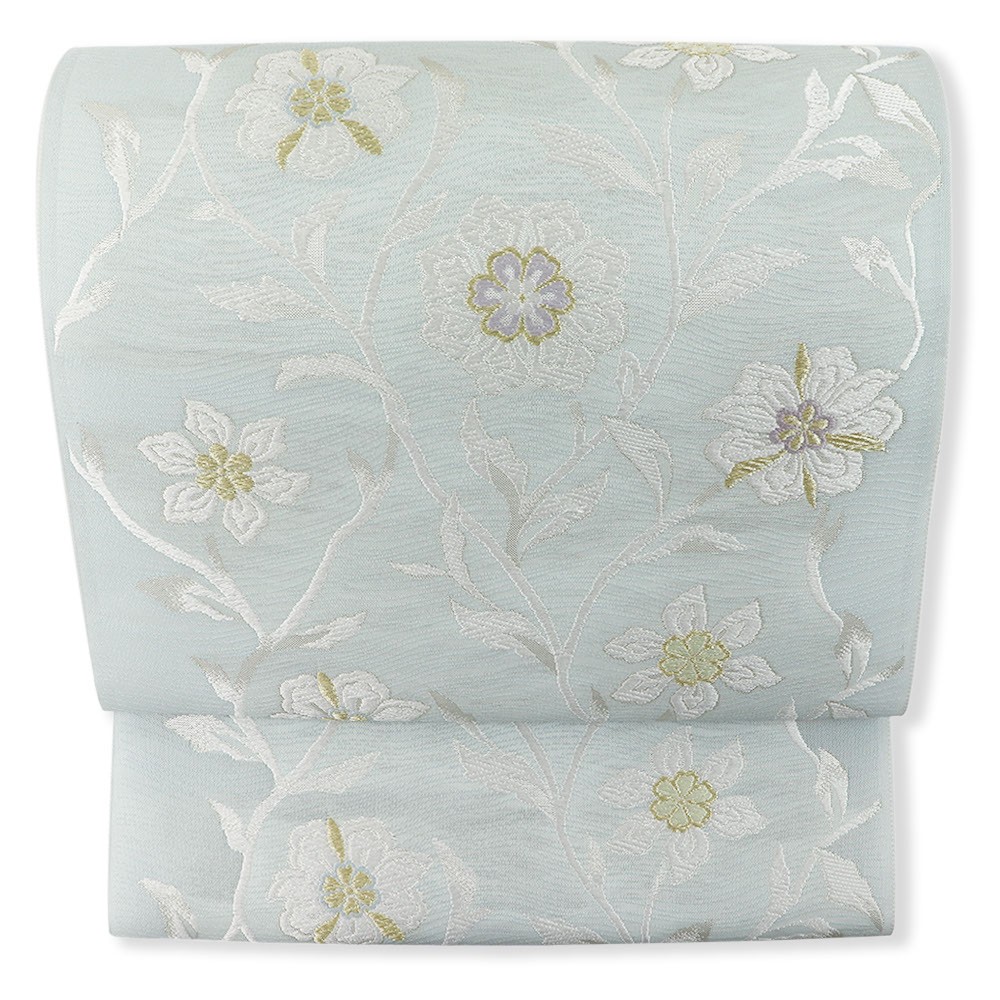 水色の帯地に、金糸や銀糸を織り込んだ華紋の煌めきと光沢感が美しい一品。しっとり柔らかい手触りで上品な印象にしてくれます。