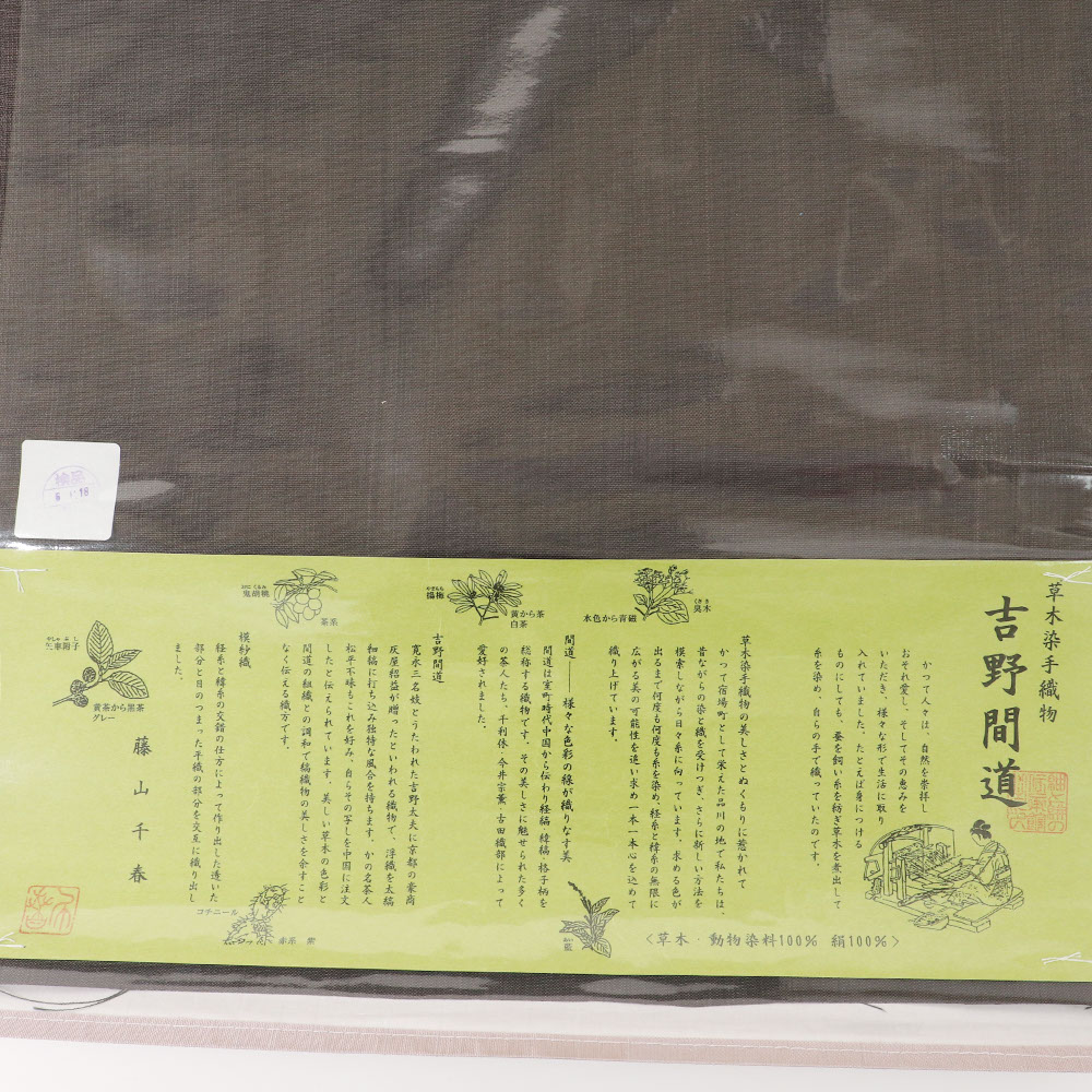 工房で栽培する草木で染めた糸を使用し、藤山氏の代名詞とも言える独特の色彩と畝を持つ吉野間道を織り上げています。草木染めによる繊細な色合いを自在に操り、絹の艶と質感の美しく表現された色と織は、長い時間をかけて糸と向き合ってきた藤山氏だからこそ成せる業。