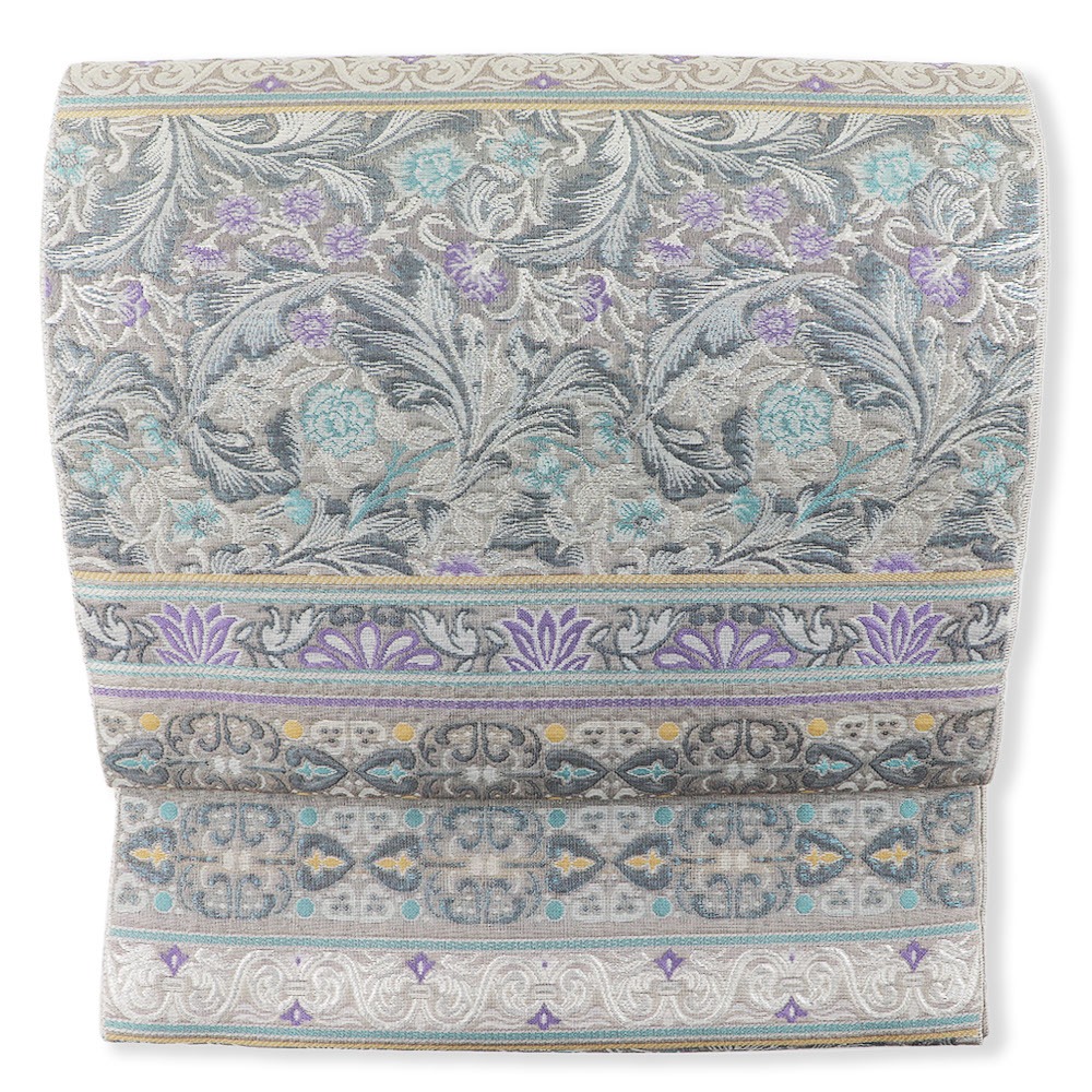 シャリ感を持った軽やかな帯地に、ふくれ織ならではの立体感がニュアンス感のある仕上がりになっています。繊細な欧風唐草段文は、重厚感とモダンさをかけ合わせたクラシカルな雰囲気に。箔糸の光沢感も、細やかな柄行きのアクセントとして際立ちます。