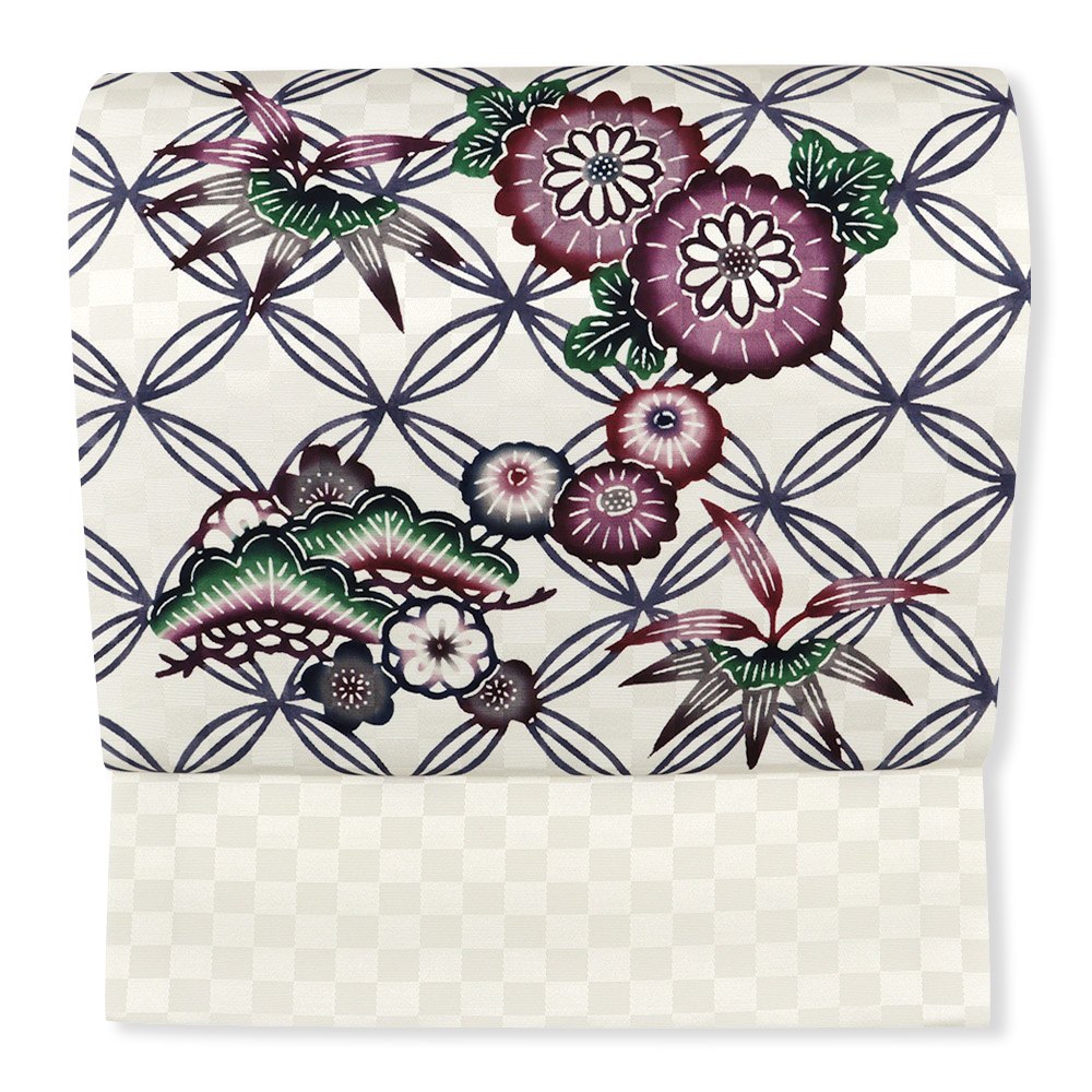 光沢が美しい市松地紋の帯地に、松竹梅、菊を染め描いた贅沢なひと品。