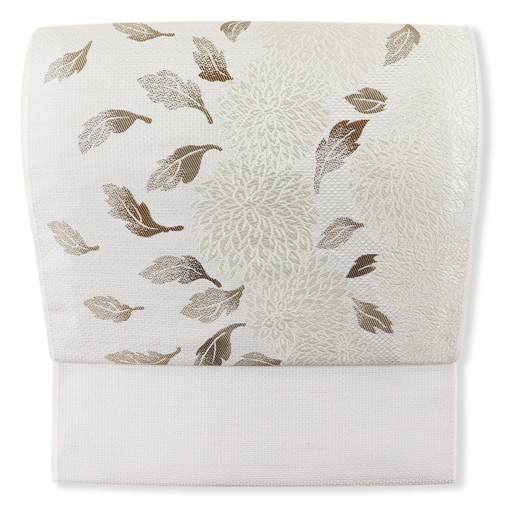 しなやかな帯地に、万寿菊が繊細に織り込まれています。白やベージュなど、彩度を抑えたデザインながら、緻密な織によって生まれる絹光で、立体感のある柄行きを実現。伝統を培ってきた老舗ならではの技術が光る逸品となっています。