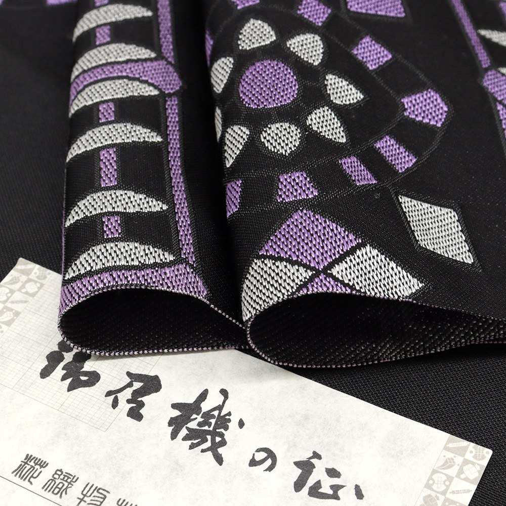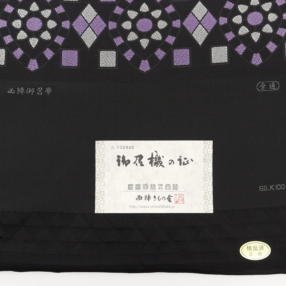 西陣の着物地を守り続けてきた機屋のしるし「御召機の証」が付いた、御召地九寸名古屋帯。