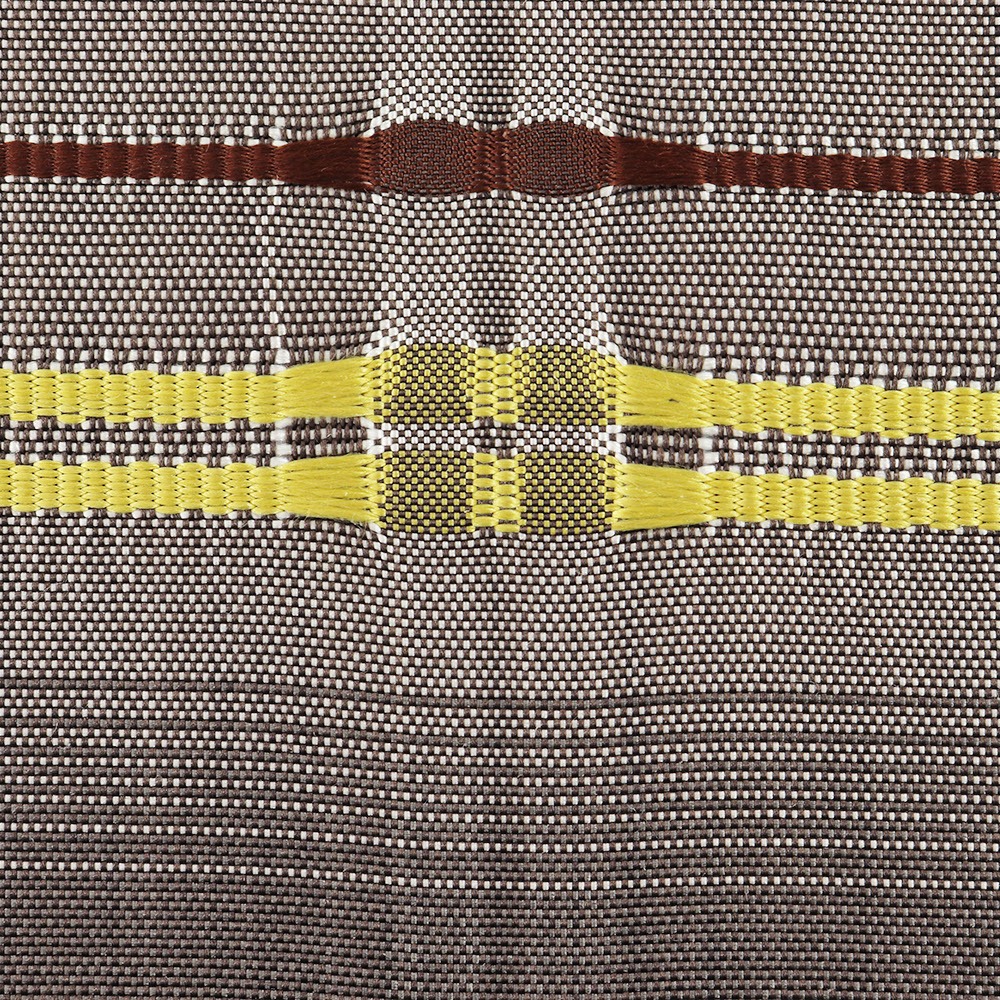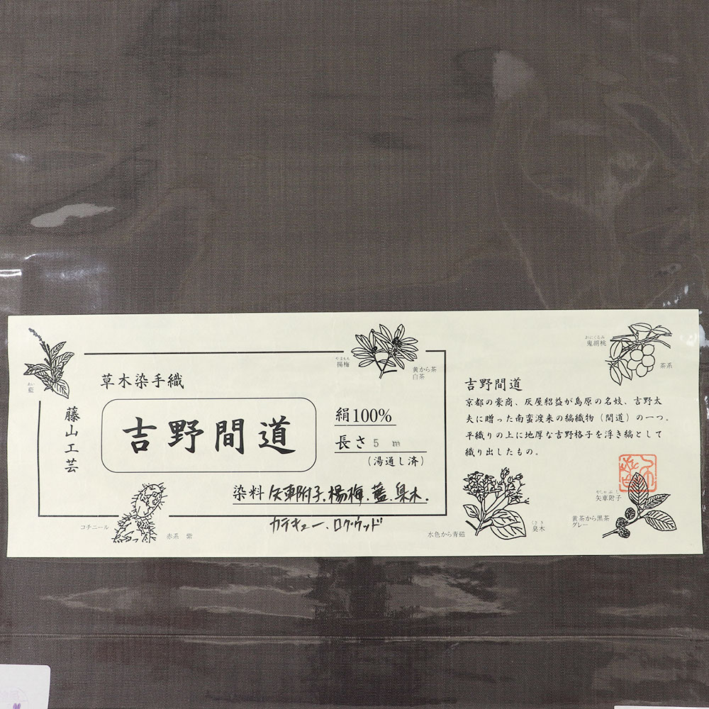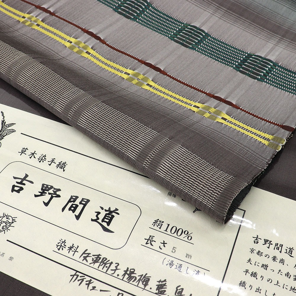 工房で栽培する草木で染めた糸を使用し、藤山氏の代名詞とも言える独特の色彩と畝を持つ吉野間道を織り上げています。草木染めによる繊細な色合いを自在に操り、絹の艶と質感の美しく表現された色と織は、長い時間をかけて糸と向き合ってきた藤山氏だからこそ成せる業。こちらの帯は、6種類の草木から生まれた豊かな色彩を帯元でお楽しみいただけます。