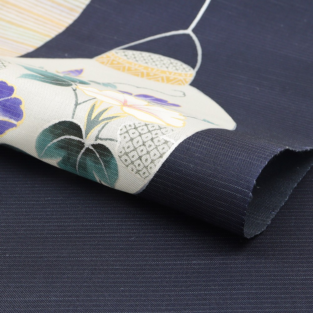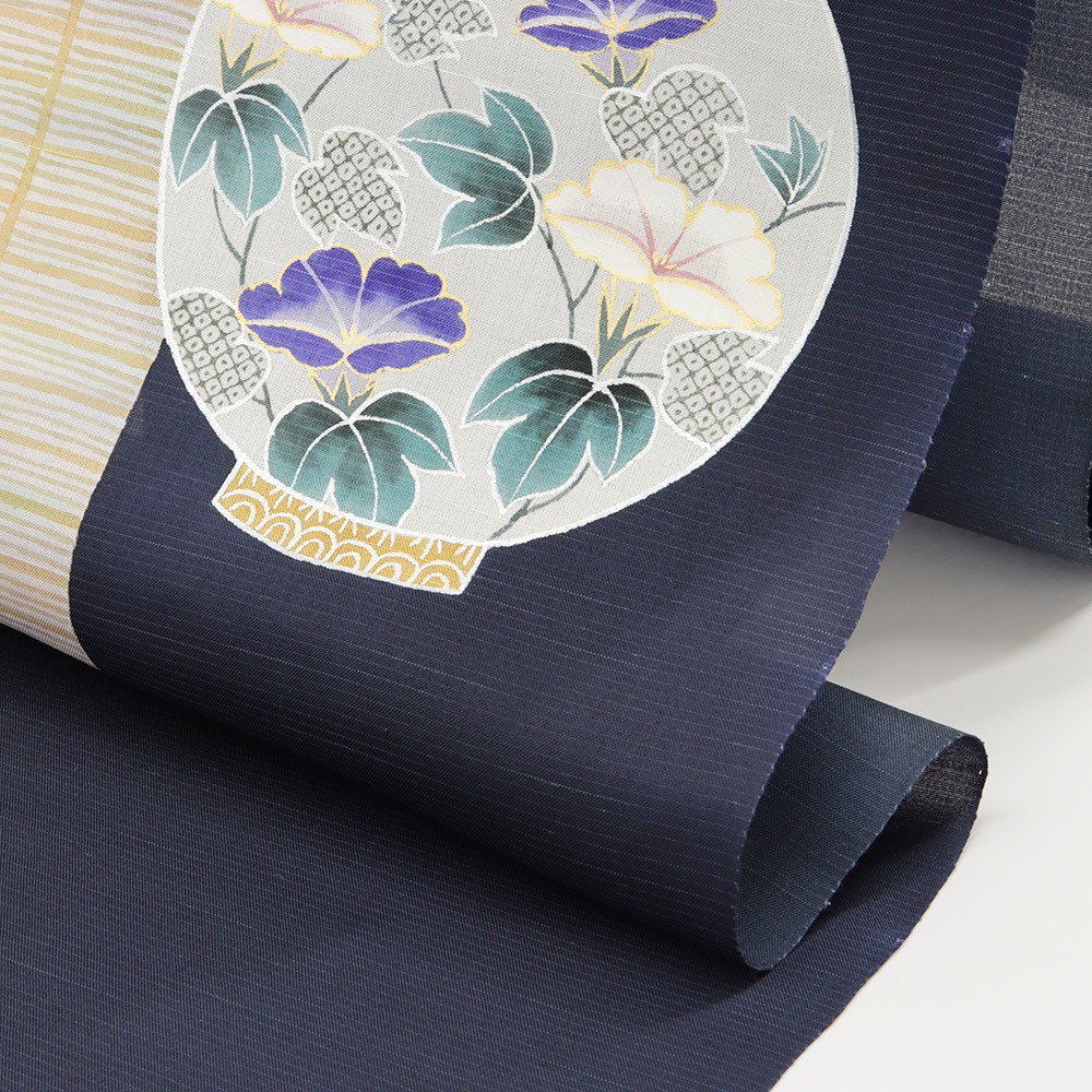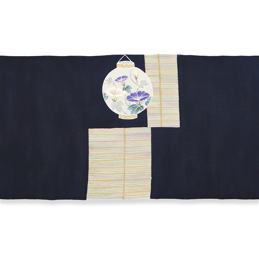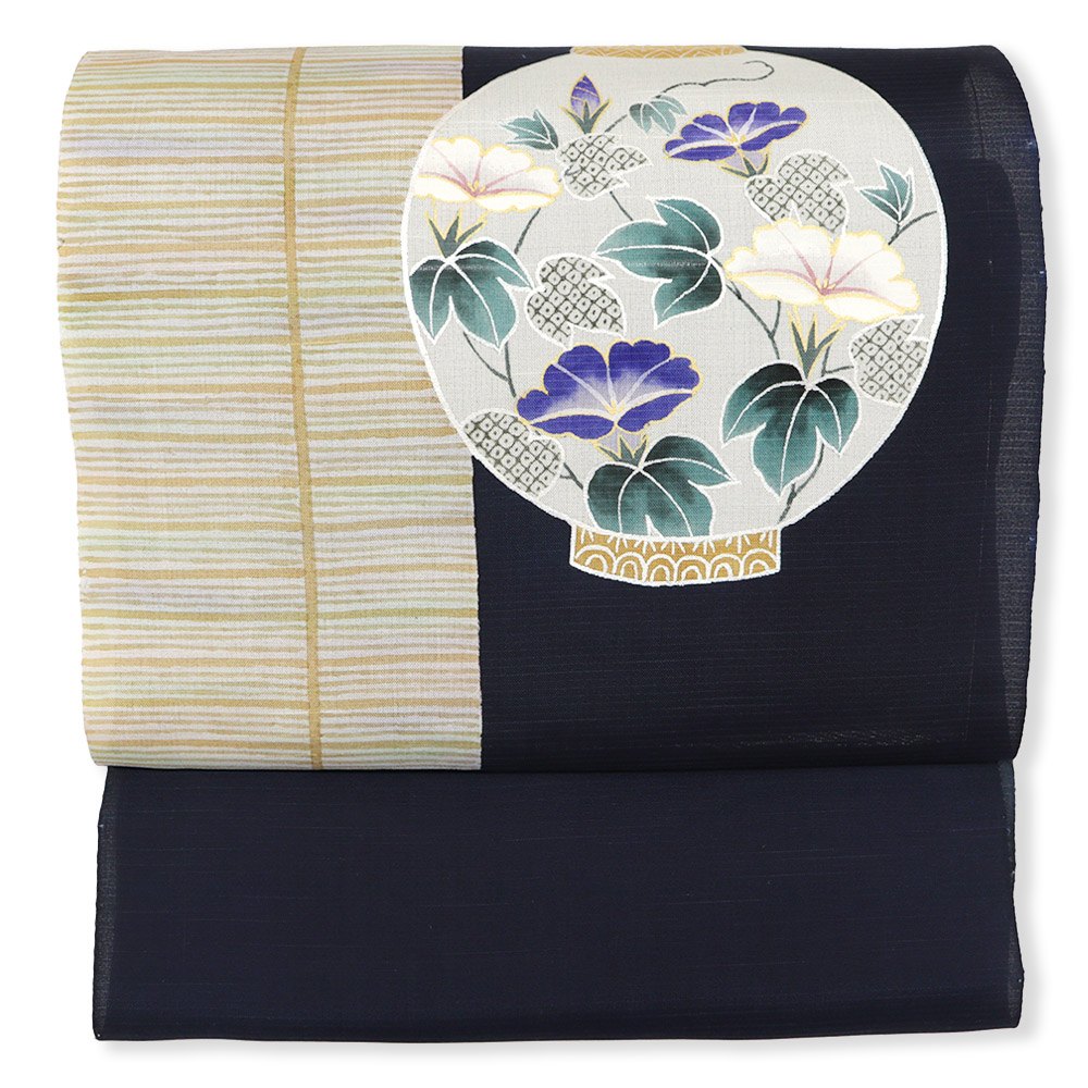 サラッとかろやかな節入り帯地に、朝顔模様の提灯が描かれました。
