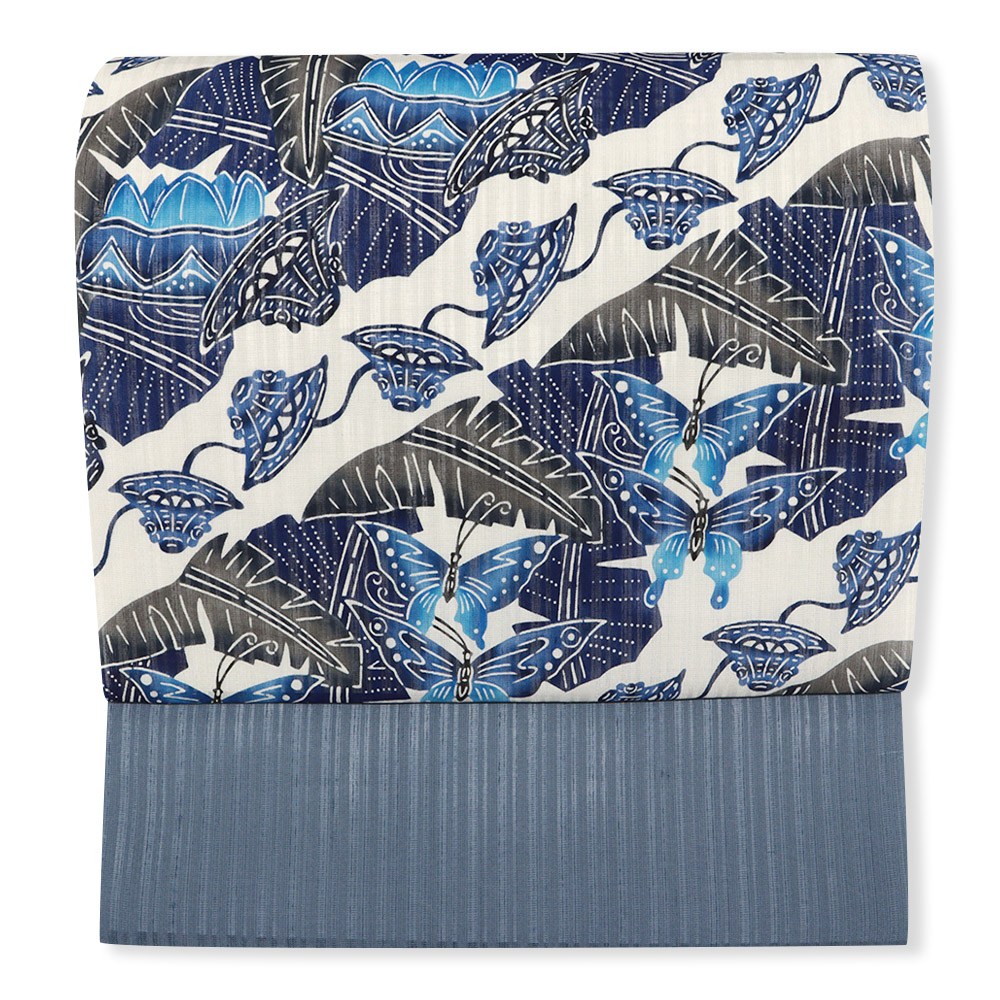 かろやかな小千谷織の帯地に芭蕉と花笠、蝶が舞う様を描いた一本。
