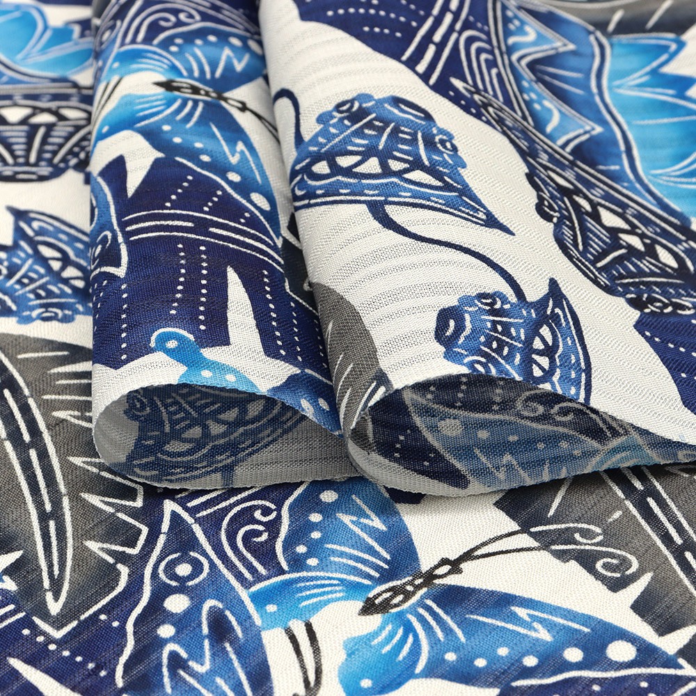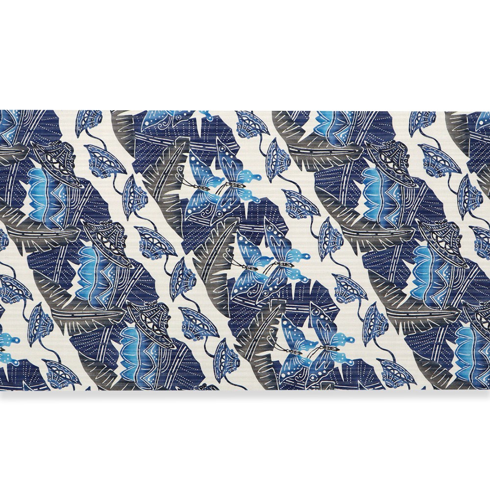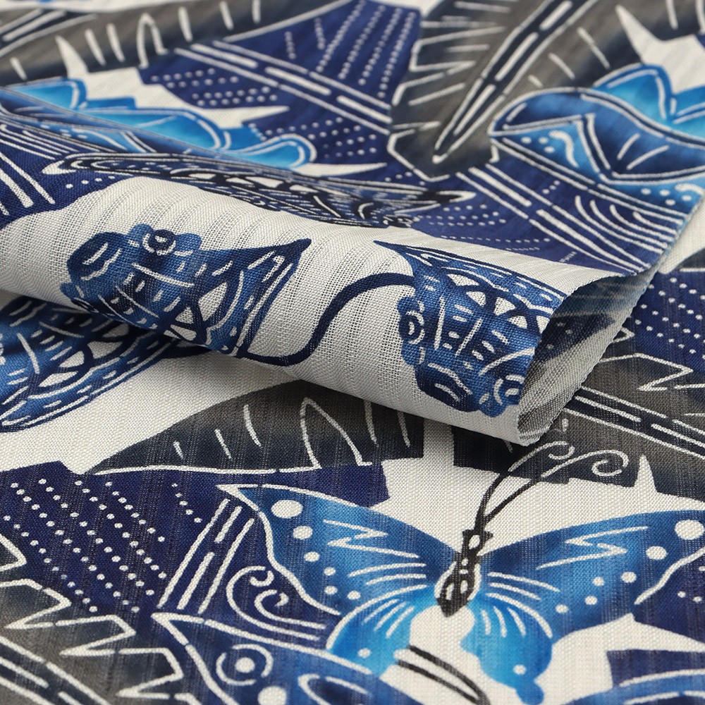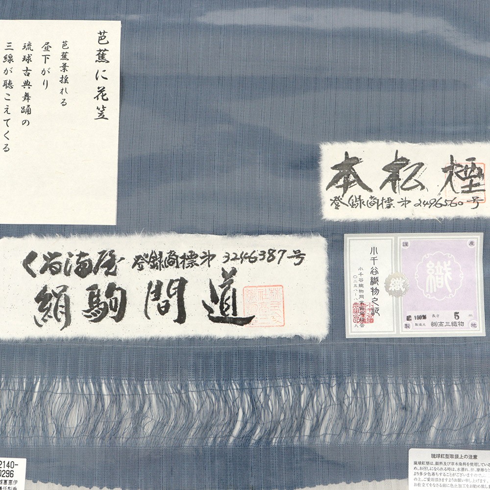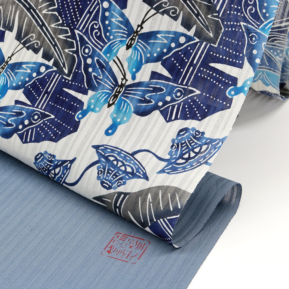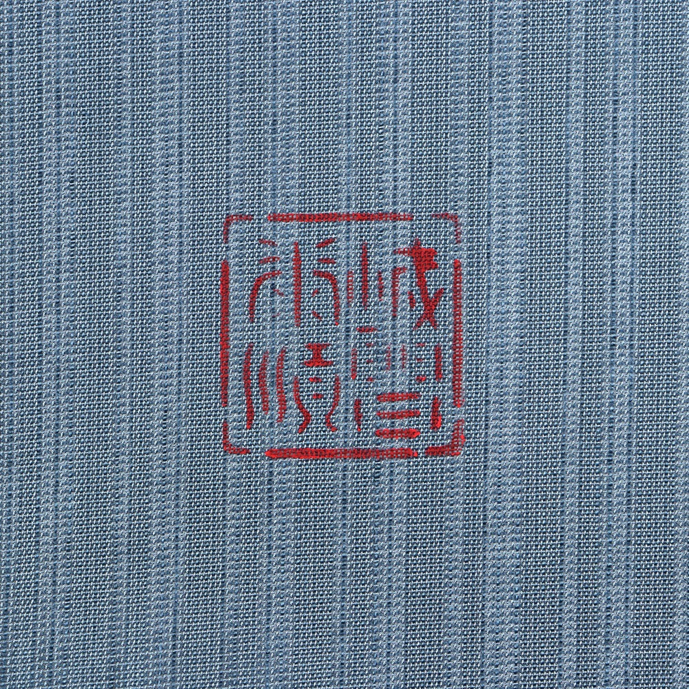 藍の重なりが深みをもたらす、色彩美しい仕上がりです。着物に合わせられるよう、原色よりも柔らかめの中間色を用い、紅型独自の「ゆらぎ」を表現した城間氏ならではの温かみが感じられます。