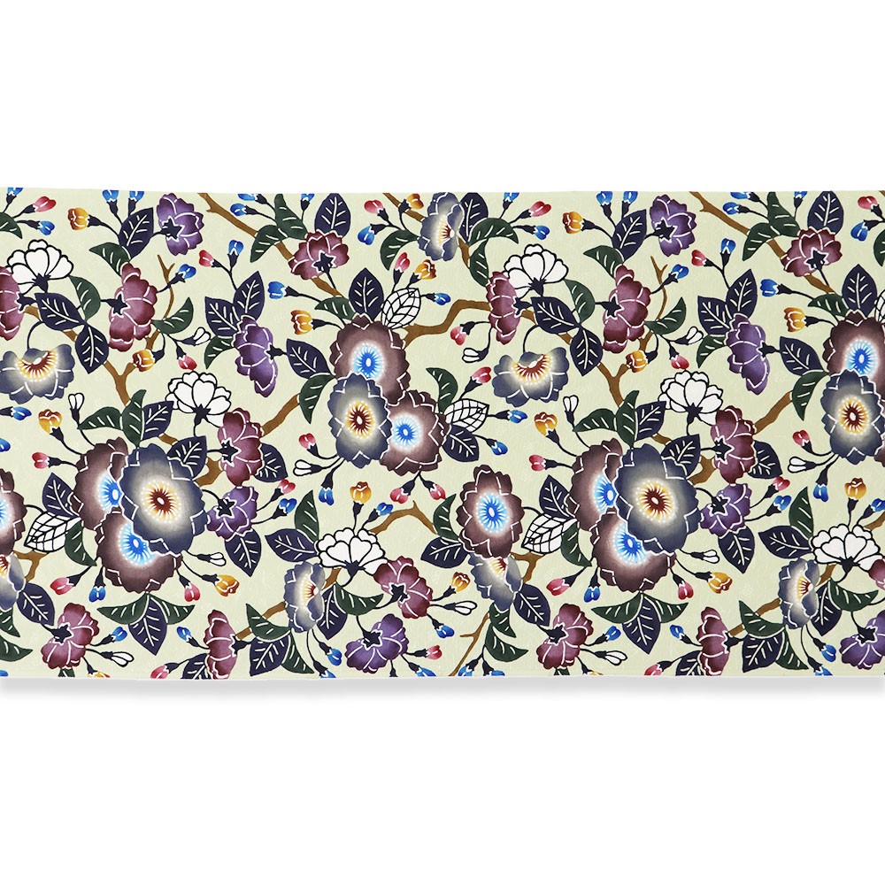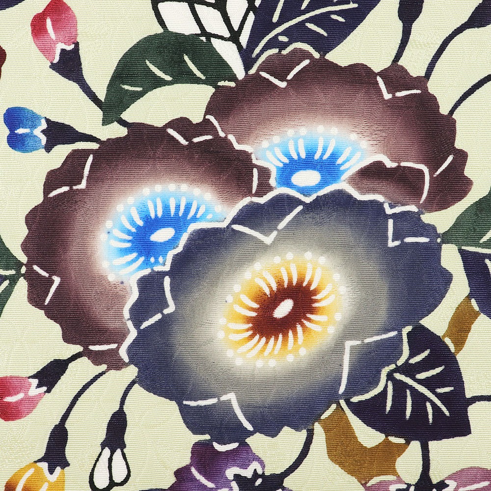 八重桜をパターン柄に落とし込んだモダンな柄行きです。淡い色合いで表現されることが多い桜を、茶色や青、紫などを使って描いており、渋さや粋を感じられるデザインに。着物に合わせられるよう、原色よりも柔らかな中間色を用い、紅型独自の「ゆらぎ」を表現した城間氏ならではの温かみも感じられる仕上がりです。