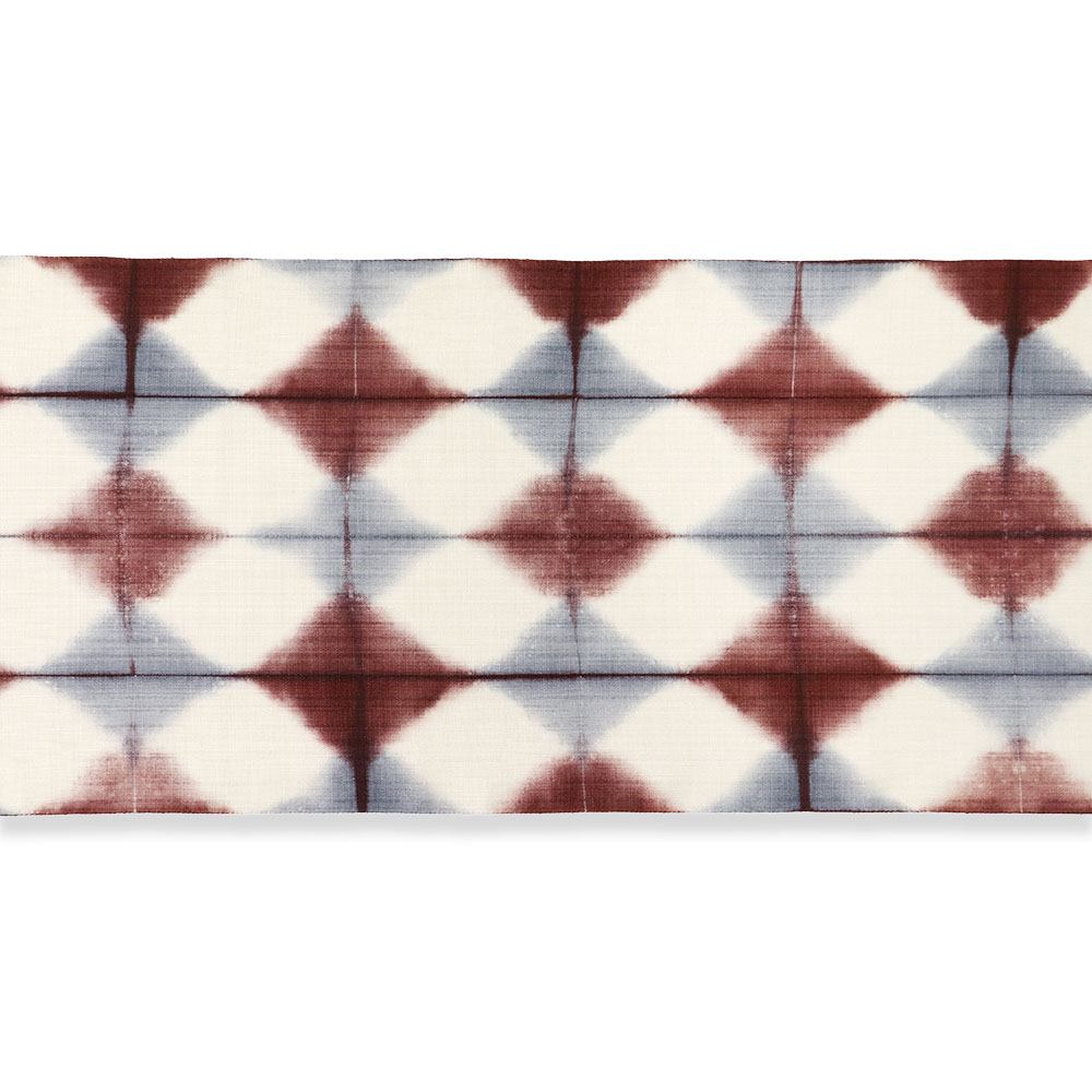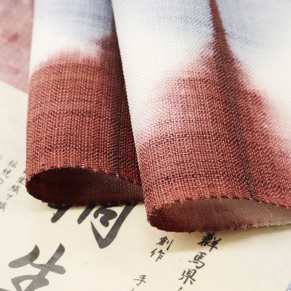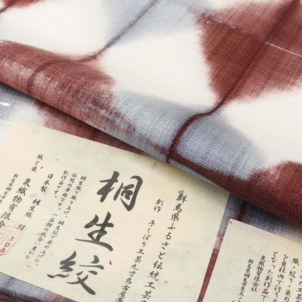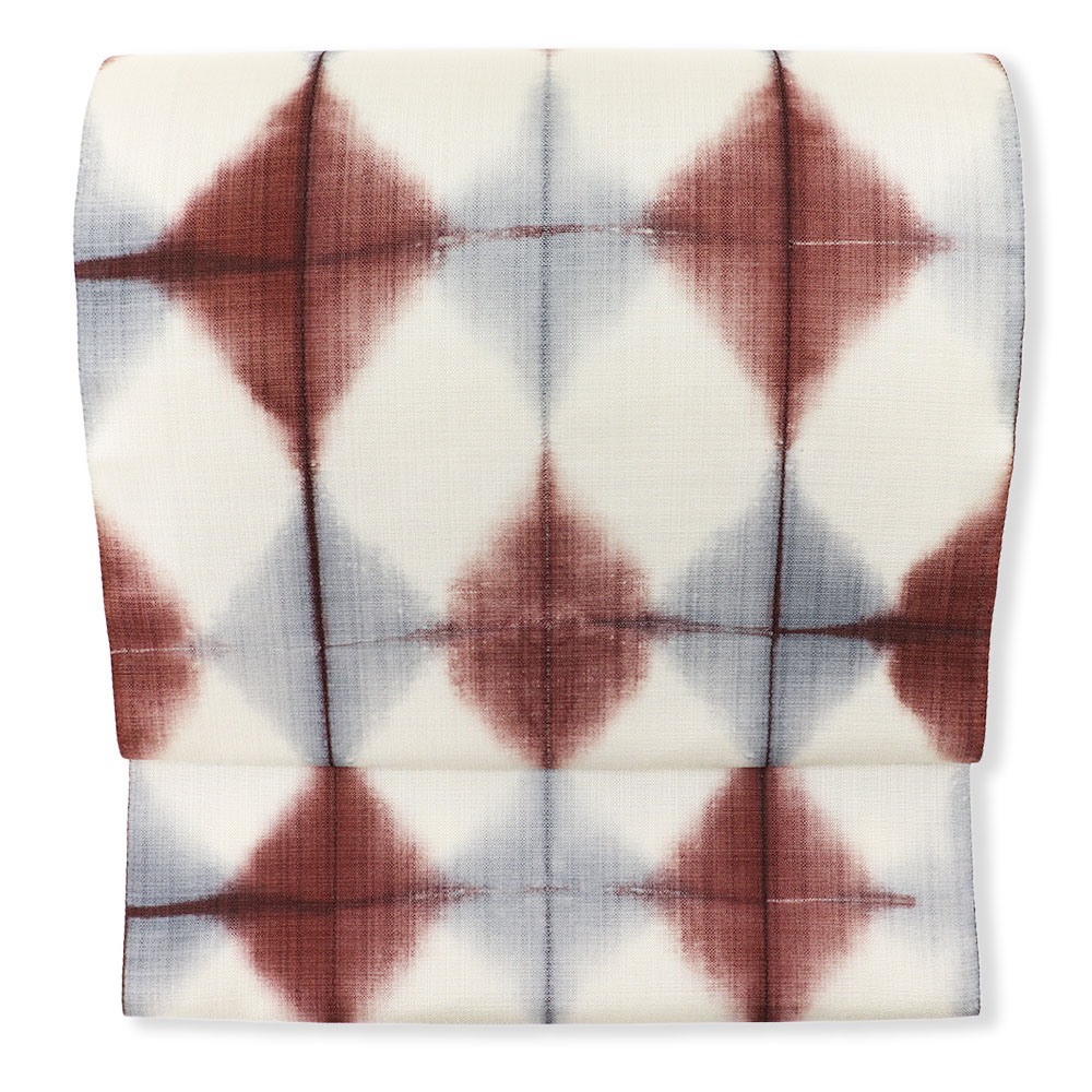 ほどよいハリと軽さを兼ね備えた生地に、茶色と灰色の絞り模様が美しい逸品。鮮やかな発色ながら光に透けるような透明感も持ち合わせ、淡くにじむようなぼかし模様が夏の帯元を涼やかに彩ります。