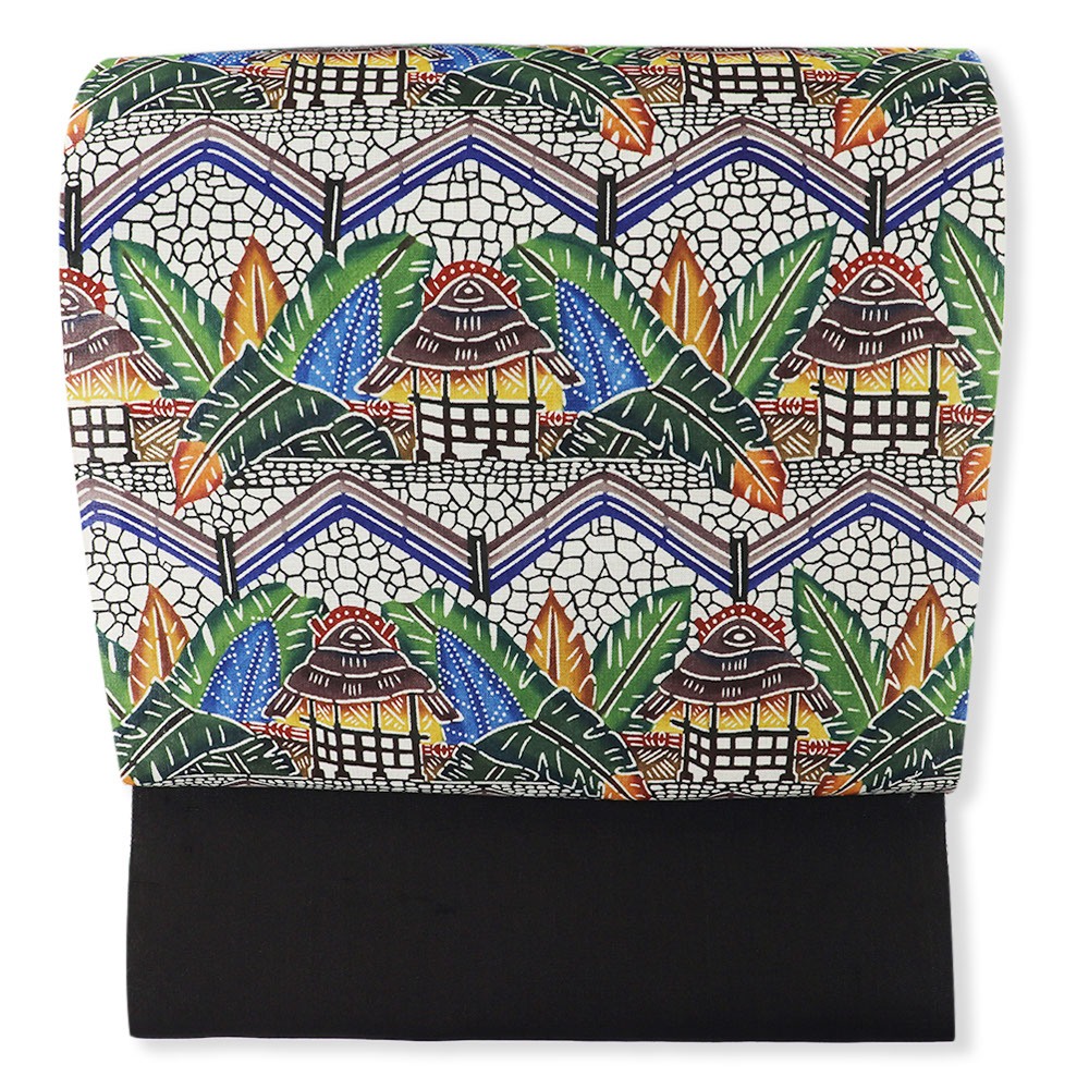 茶色やエンジの中に鮮やかな緑や青を少しいれることで、重厚感と爽やかさを併せ持つ沖縄スタイルを感じさせてくれる色彩。無地感のある着物に合わせると、この帯の美しさが一層映えて洗練されたスタイルを着姿に映しだしてくれるでしょう。