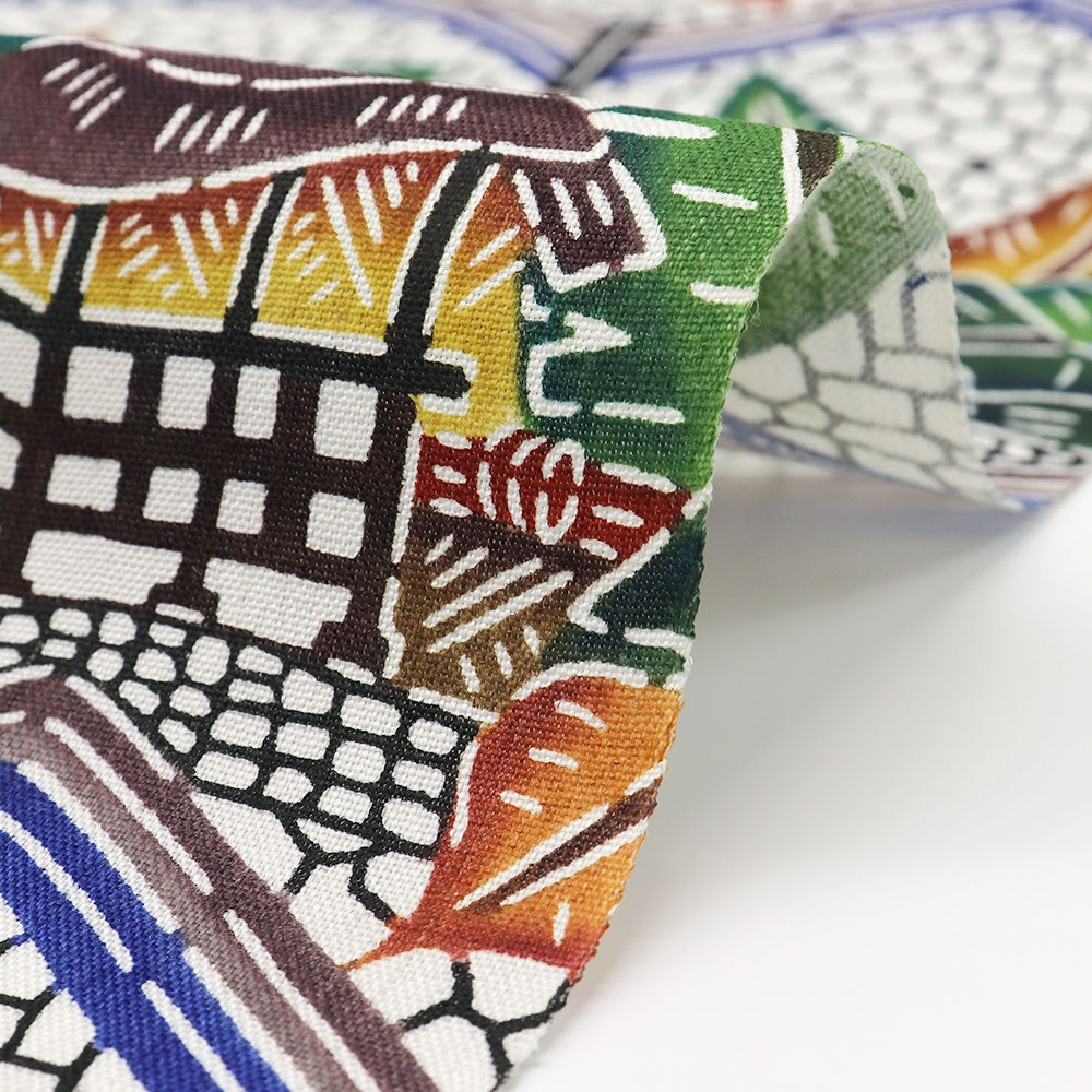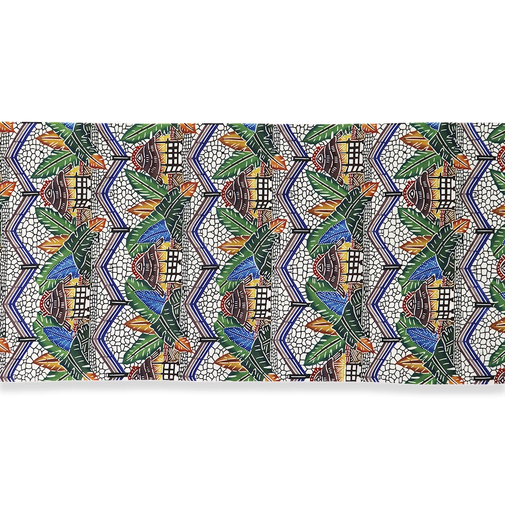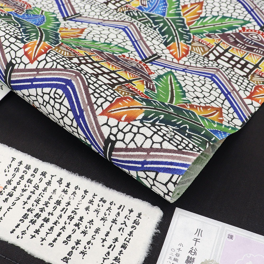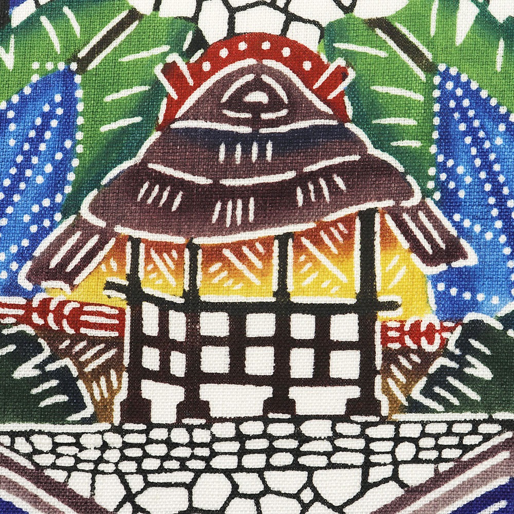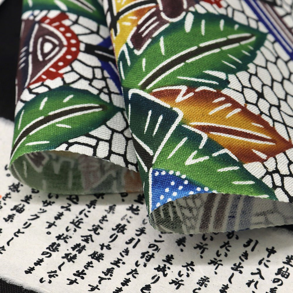 石垣に芭蕉と糸干しを描き、沖縄の風景をパターン柄で表現したこちらは、紅型ならではのエキゾチック感を残しつつ、普段着にも落とし込みやすいモダンな仕上がりになっています。