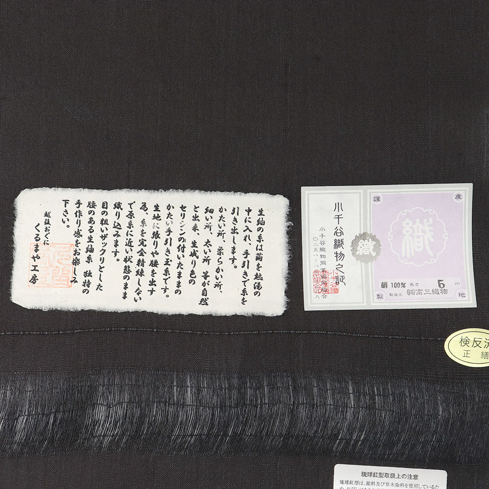 帯地には、【高三織物】の小千谷縮を使用。強度の撚りをかけた緯糸を用いて、丹念に織り上げる小千谷縮は、湯もみ特有の縦シボと、生紬ならではのシャリ感が特徴。ほどよい透け感と生地の軽さで、かろやかな着け心地を実現します。