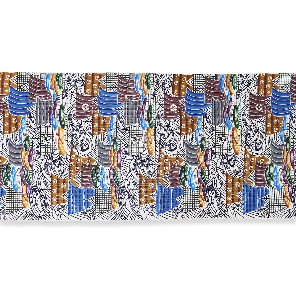 茶色やエンジの中に鮮やかな青を少しいれることで、重厚感と爽やかさを併せ持つ沖縄スタイルを感じさせてくれる色彩。無地感のある着物に合わせると、この帯の美しさが一層映えて洗練されたスタイルを着姿に映しだしてくれるでしょう。