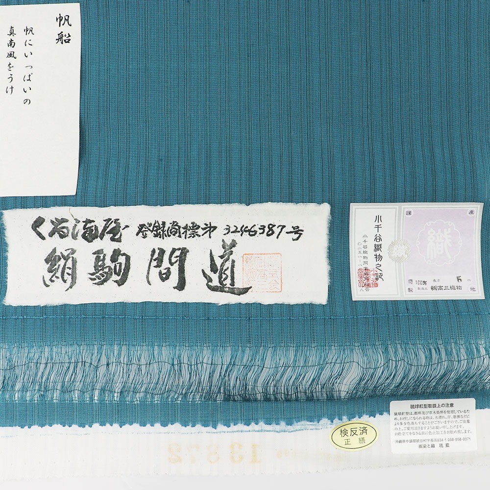 帯地には、【高三織物】の小千谷縮を使用。強度の撚りをかけた緯糸を用いて、丹念に織り上げる小千谷縮は、湯もみ特有の縦シボとシャリ感が特徴。ほどよい透け感と生地の軽さで、かろやかな着け心地を実現します。