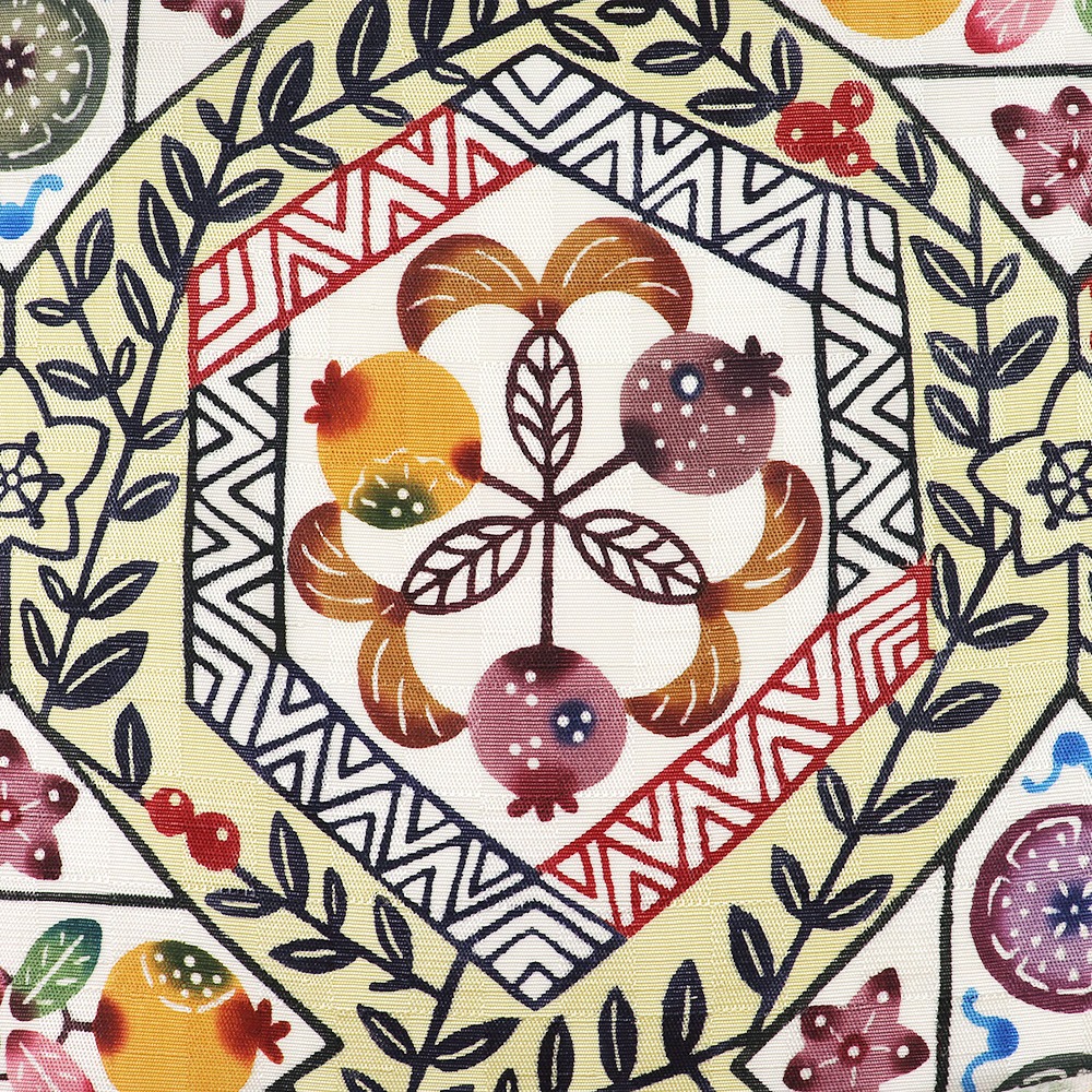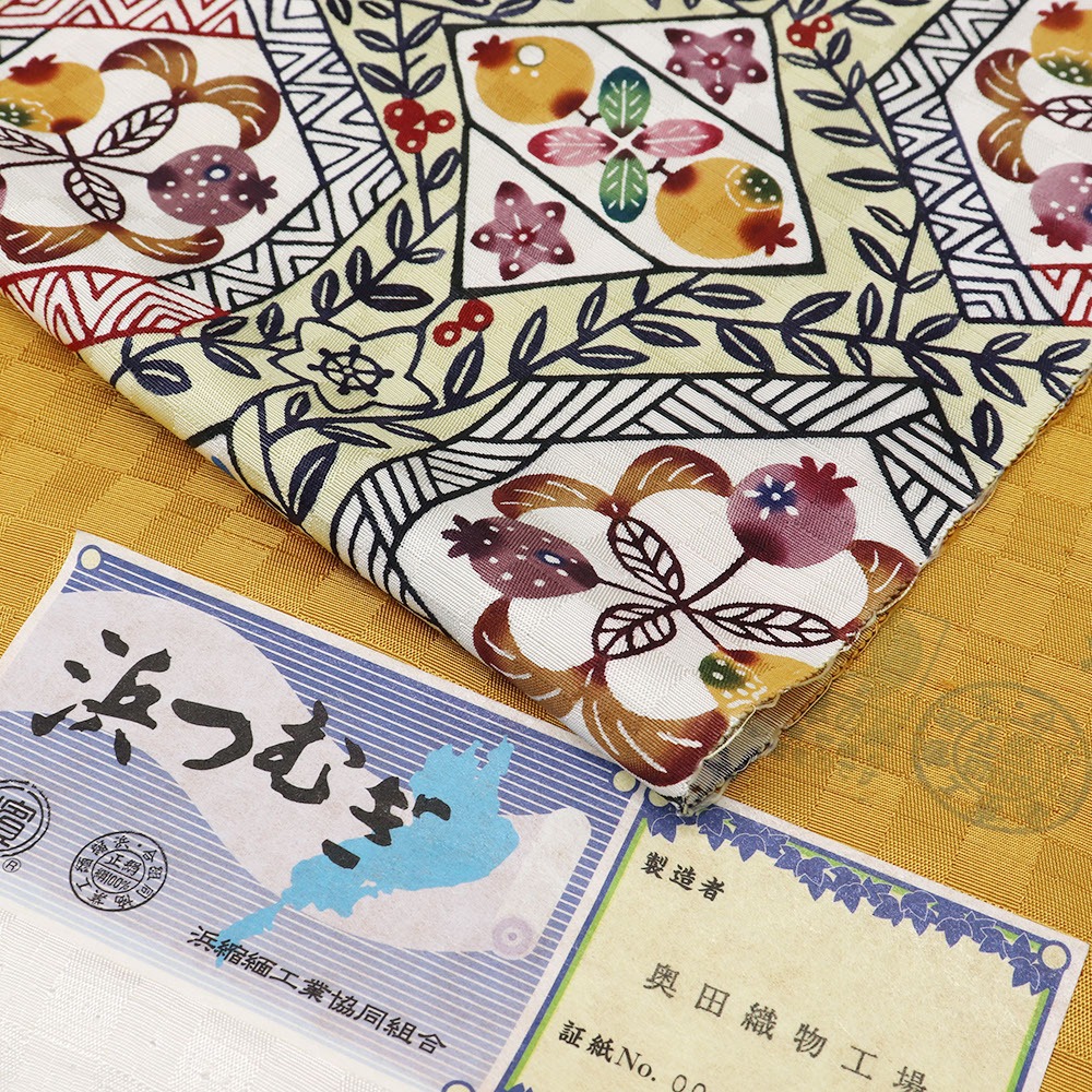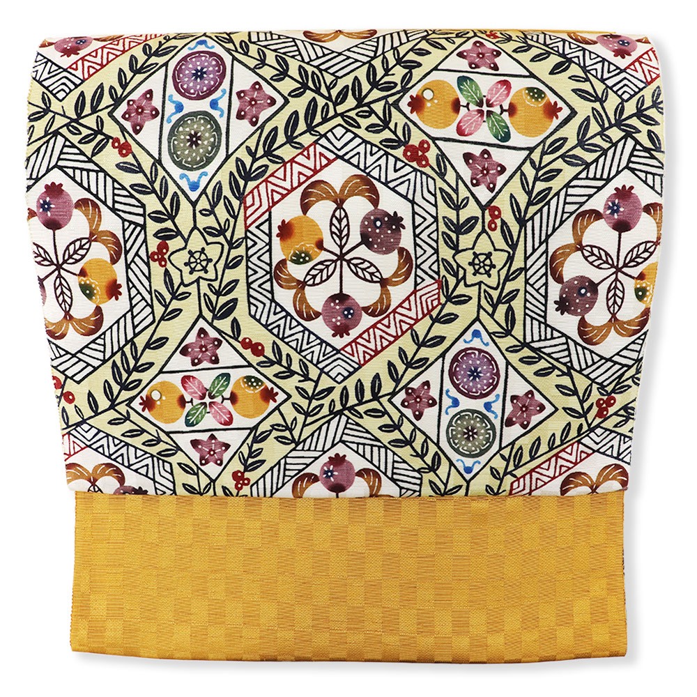 かろやかな市松地紋の帯地に、バンシルー(グァバ)を亀甲模様に落とし込んで描いた一本。