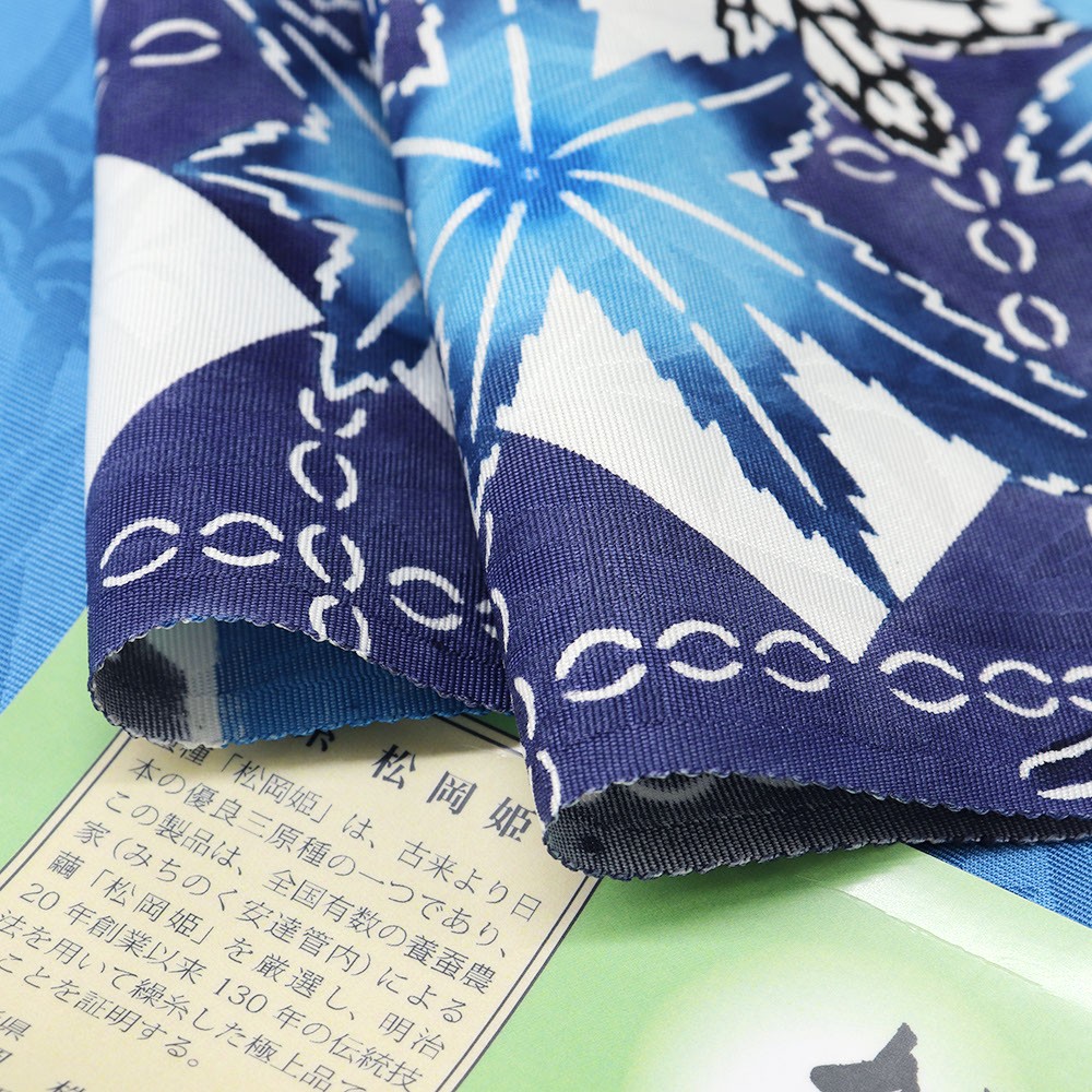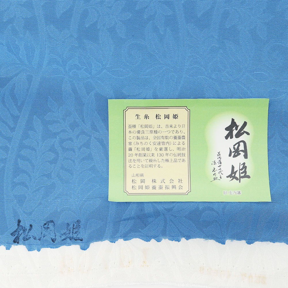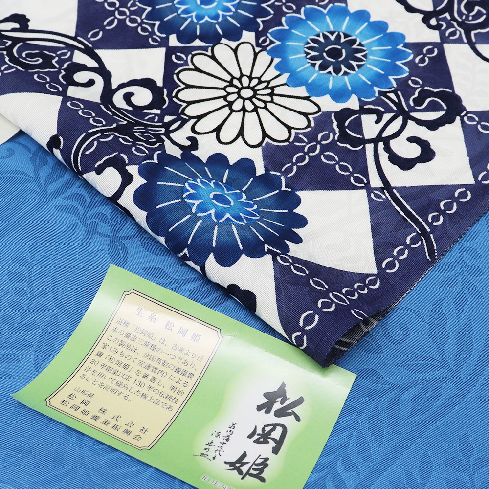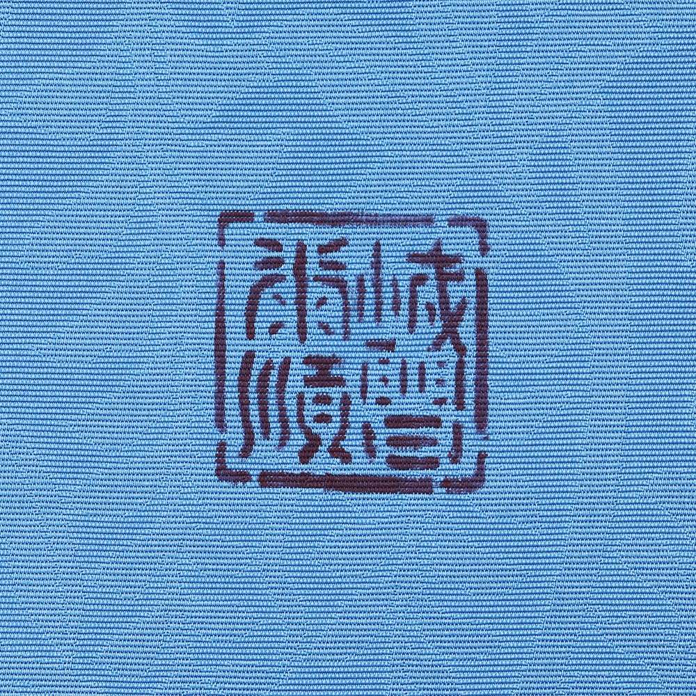 「松岡姫」の発祥地証明が貼られた【伊と幸】による帯地に、市松模様と菊かえでを描いた柄行きです。青色を基調とした色合いが、優雅な柄行きに深みと粋を与えてくれる仕上がりに。着物に合わせられるよう、原色よりも柔らかな中間色を用い、紅型独自の「ゆらぎ」を表現した城間氏ならではの温かみが感じられる仕上がりです。