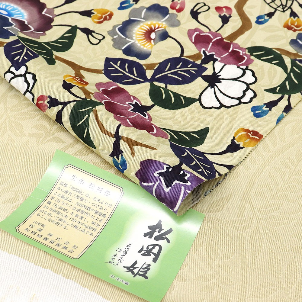 「松岡姫」の発祥地証明が貼られた【伊と幸】による帯地に、八重桜を描いた柄行きです。淡い色合いで表現されることが多い桜を、青灰色や紫などを使って描いており、渋さや粋を感じられるデザインに。着物に合わせられるよう、原色よりも柔らかな中間色を用い、紅型独自の「ゆらぎ」を表現した城間氏ならではの温かみも感じられる仕上がりです。