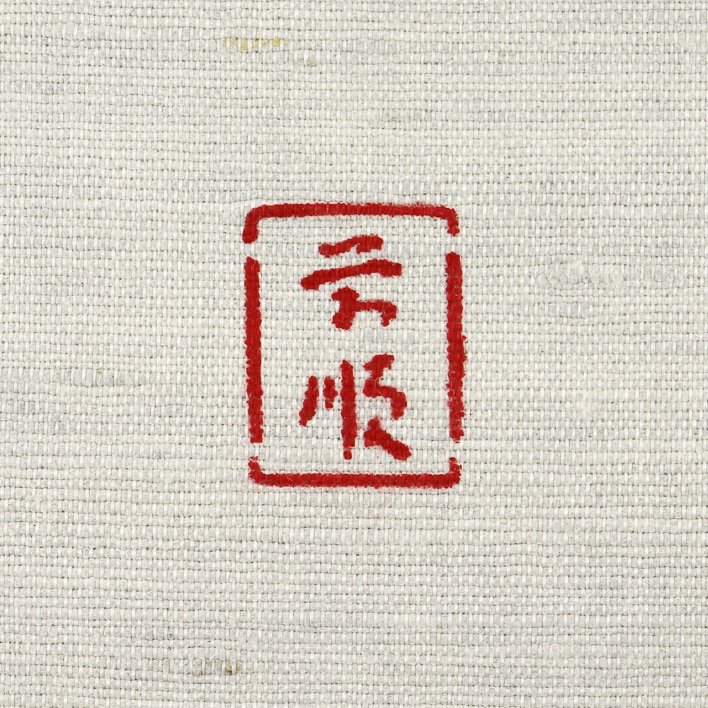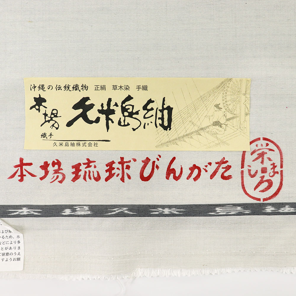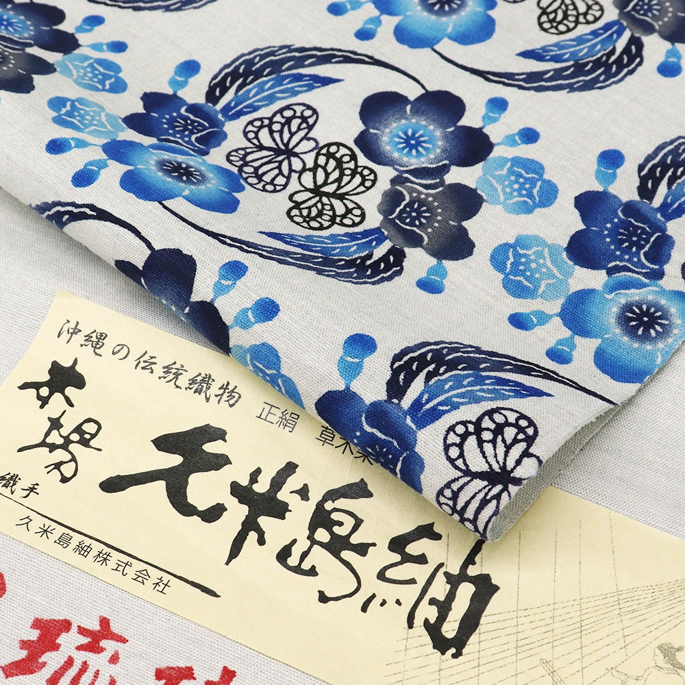 優しい手触りの久米島紬に、ゆうな染めで美しい灰色を染めた帯地の一本。沖縄の固有種であるイジュの花をモチーフに丸紋を描いています。イジュの花は美しいだけでなく、漁に使用することもあるそう。着物に合わせられるよう、原色よりも柔らかめの中間色を用い、紅型独自の「ゆらぎ」を表現した城間氏ならではの温かみが感じられる仕上がりです。無地感のある着物に合わせると、この帯の美しさが一層映えて洗練されたスタイルを着姿に映しだしてくれるでしょう。