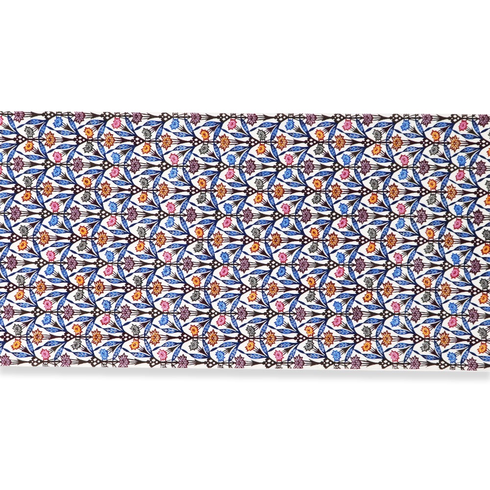 りんどうの花をパターン柄に落とし込んだ細やかな一本。限りなく広がる緻密な描線と色彩が、半世紀以上を紅型に捧げた玉那覇有公氏の手によって生みだされています。