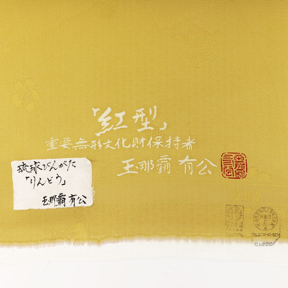 琉球紅型三大宗家である城間家に弟子入りしたのち独立し、紅型の分野で最初に重要無形文化財保持者(人間国宝)に認定された玉那覇有公氏による琉球紅型九寸帯。
