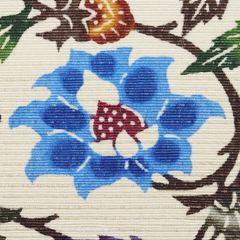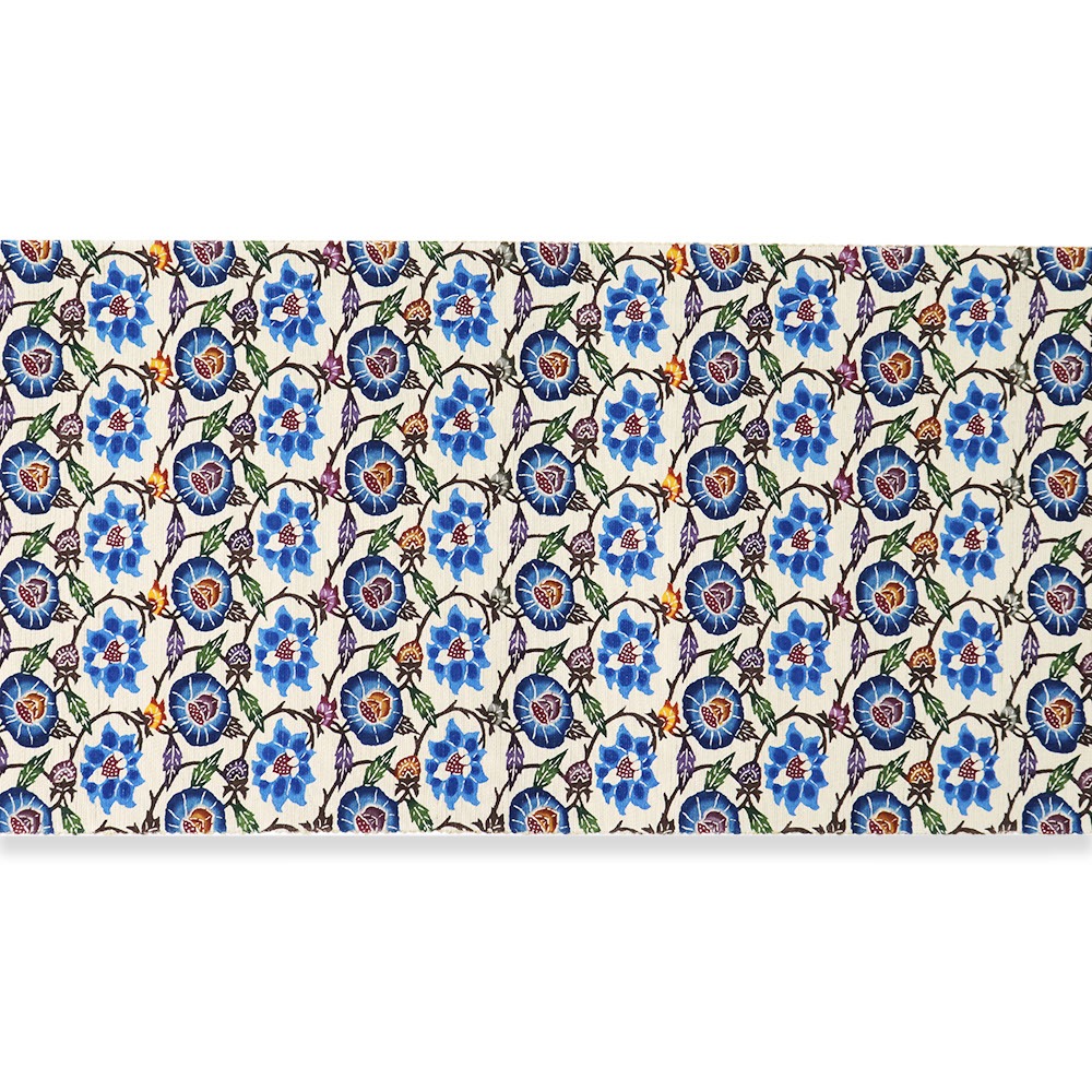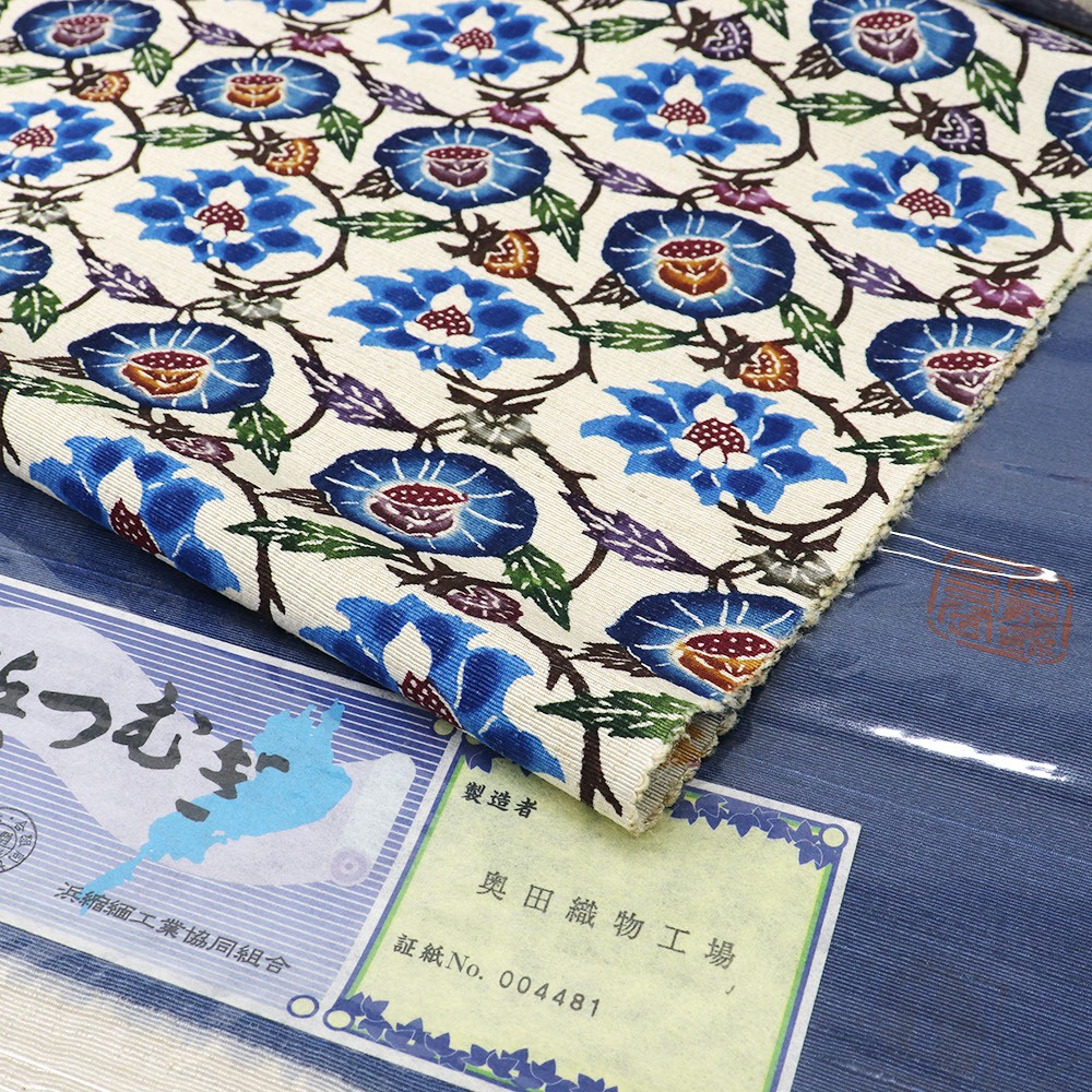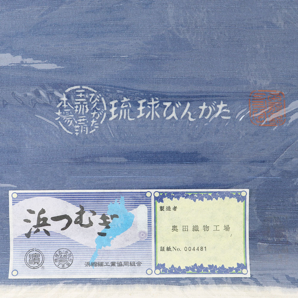 青の浜つむぎに、牡丹と蔓をパターン柄に落とし込んだ細やかな一本。限りなく広がる緻密な描線と色彩が、半世紀以上を紅型に捧げた玉那覇有公氏の手によって生みだされています。