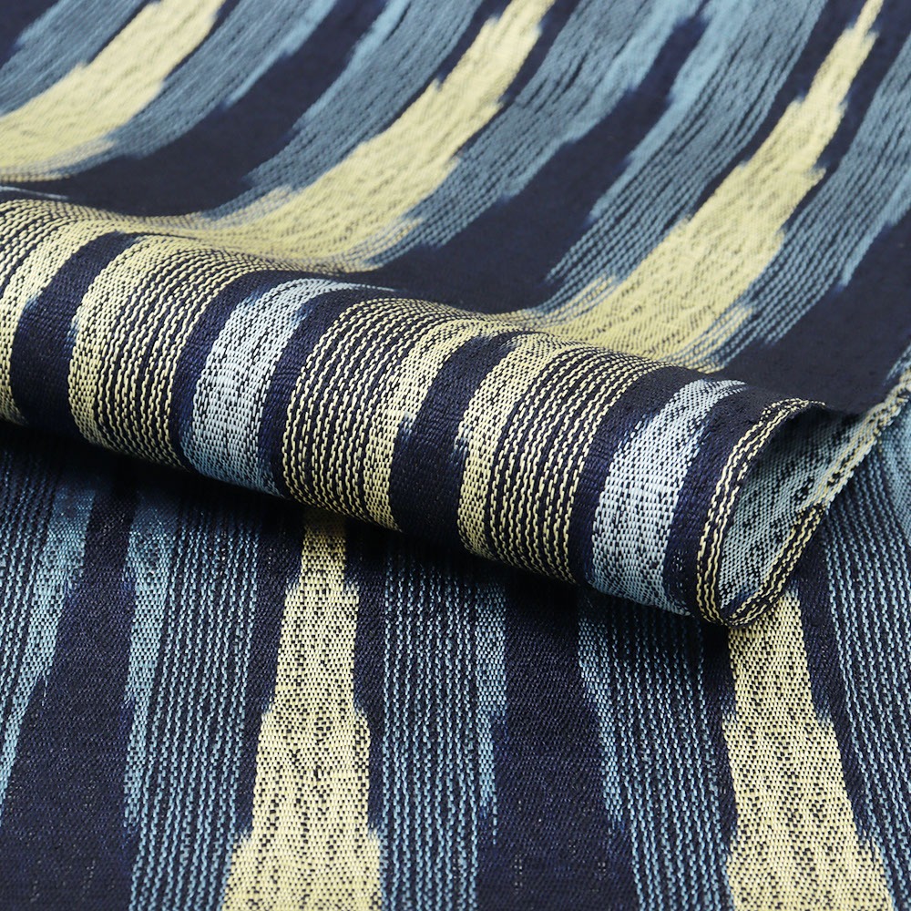 西陣織のひとつである「西陣絣」を手織りすくい機で織り上げた一本です。染め分けられた経糸をずらしながら模様を織り出していく技法で、それによって生まれるぼかしのような模様が魅力。微かな光沢を持った軽やかな生地の風合いにもご注目ください。