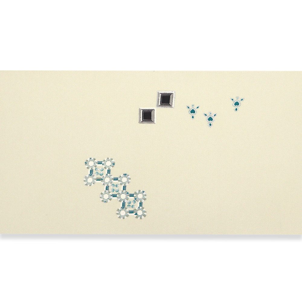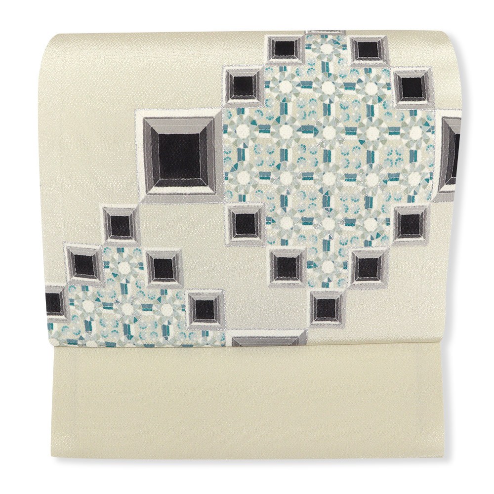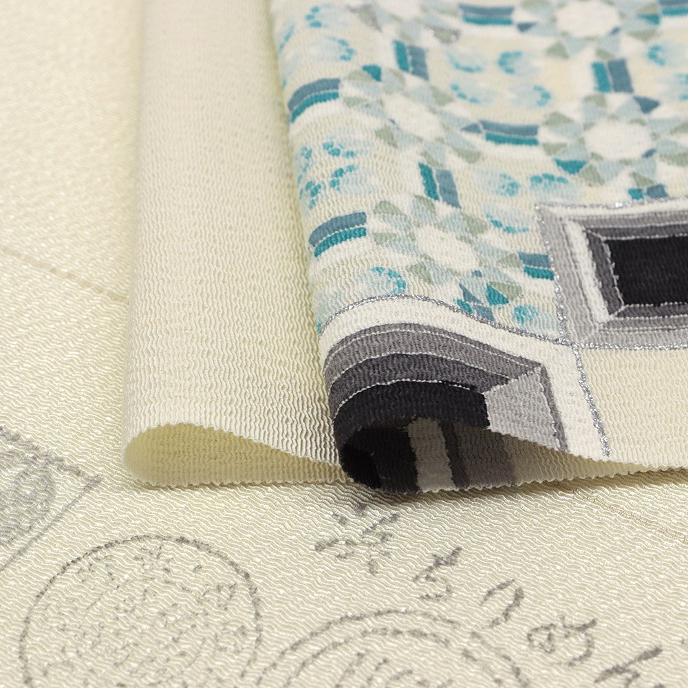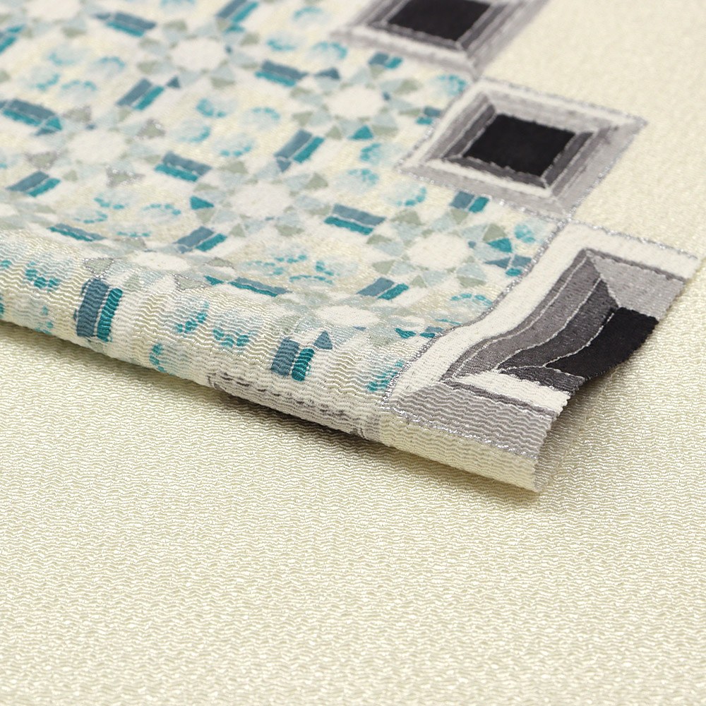 ちりめん地に染められているのは、宝石のような幾何模様。ジュエリーの硬質な輝きを表現する繊細な描線と色彩で、幻想的で上品な印象を感じられます。柄を縁取る銀彩のポイント使いも◎