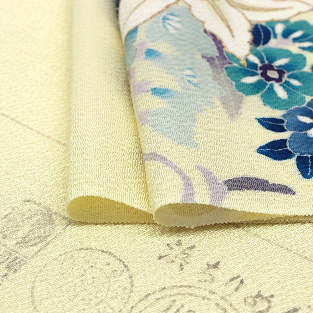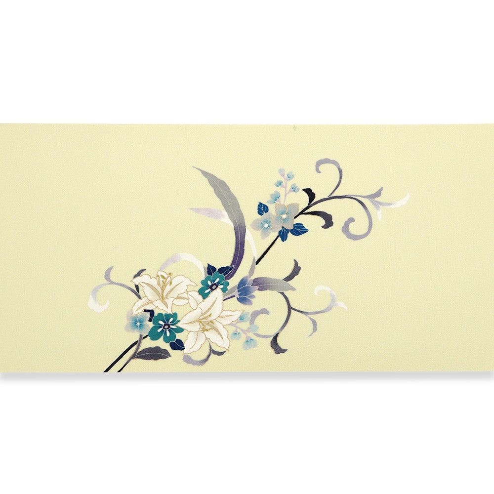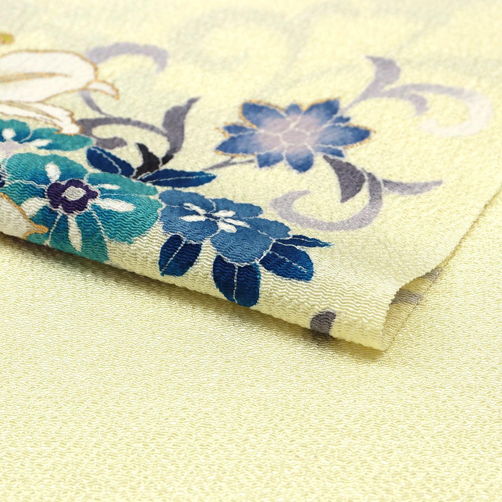 ちりめん地に染められているのは、百合唐草模様。描きこまれた花の表現で上品な仕上がりになっています。柄を縁取る金彩のポイント使いも◎