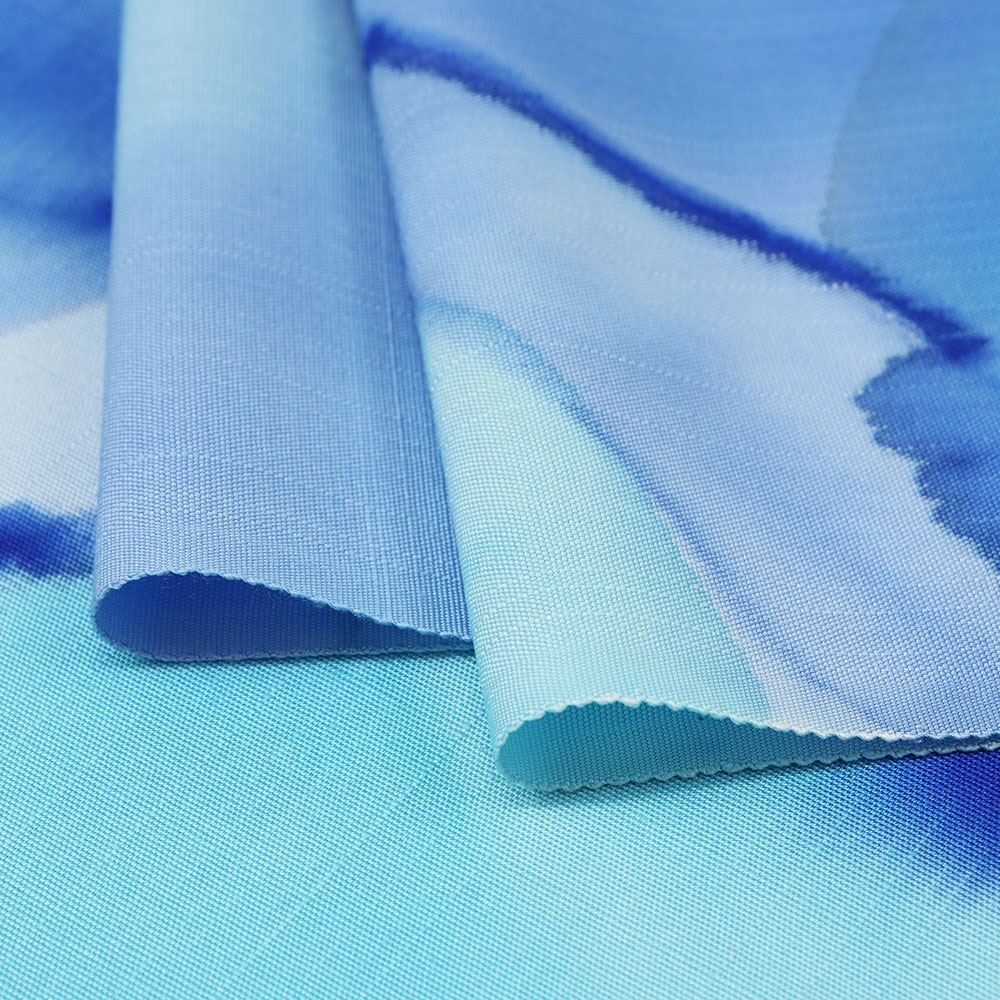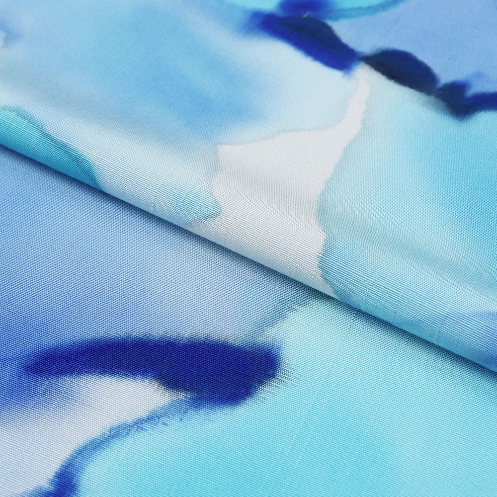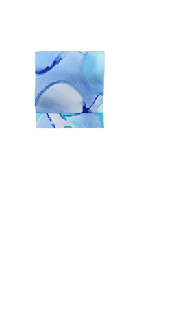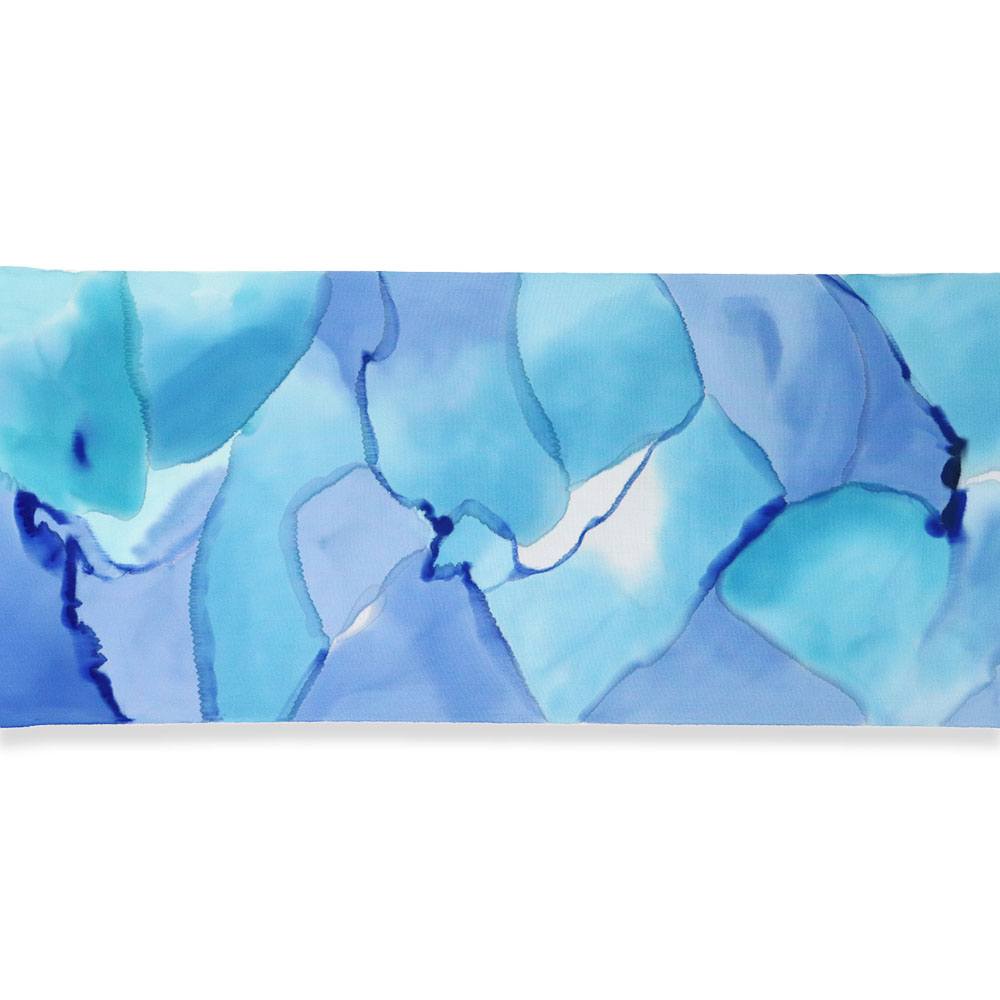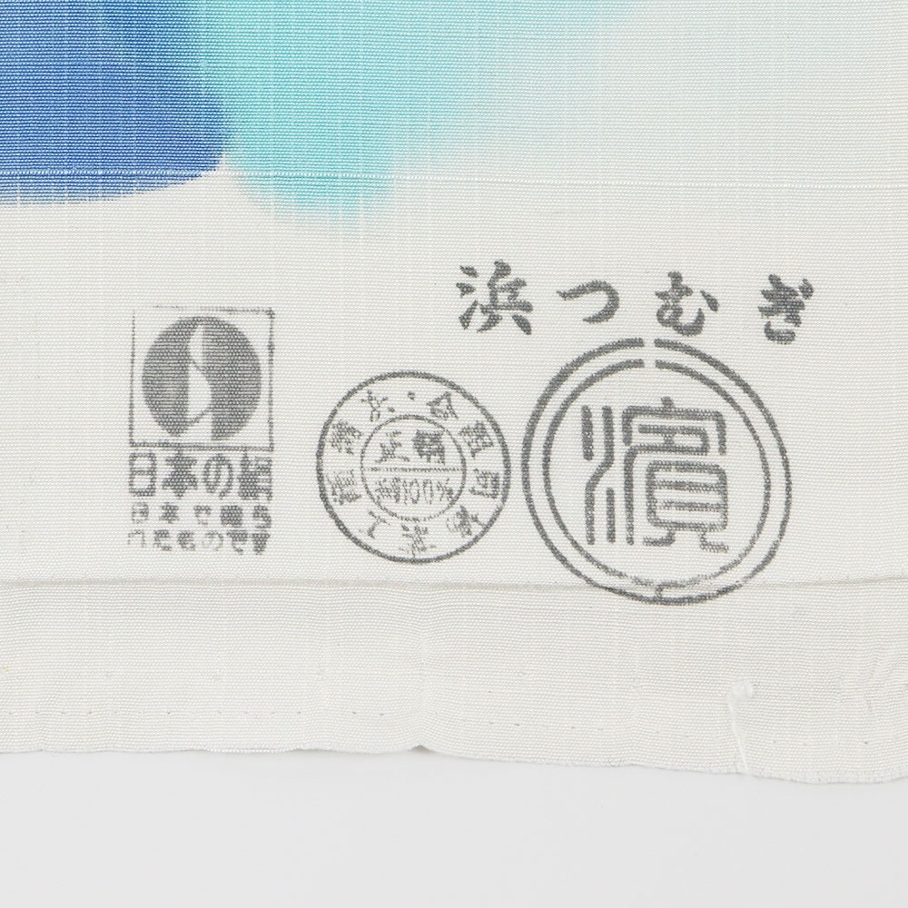 溶かした蝋で防染し染色する技法「ロウケツ染め」は、はっきりとした輪郭線や鮮やかな色彩が特徴です。こちらは輪郭線は用いず、色彩で水彩絵の具のようなにじみを総柄で表現した一本。水色や青の爽やかな色合いと濃淡が柔らかな雰囲気を演出しています。
