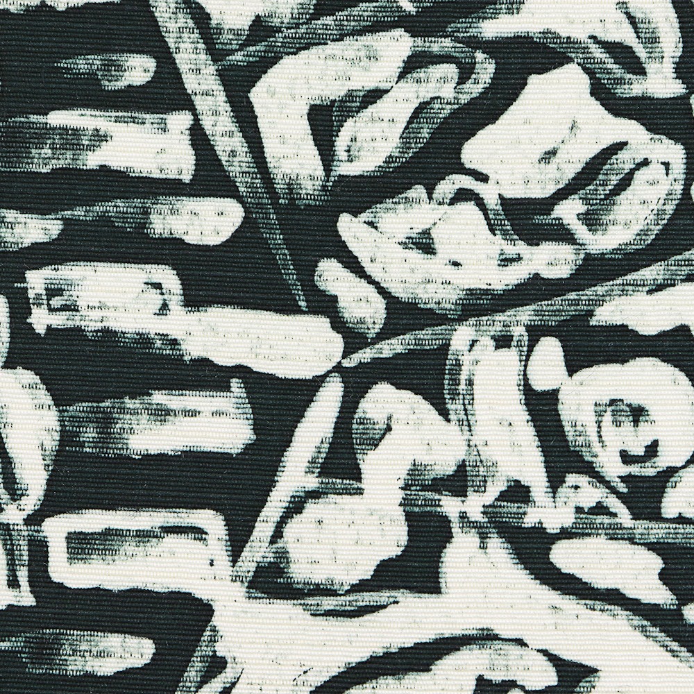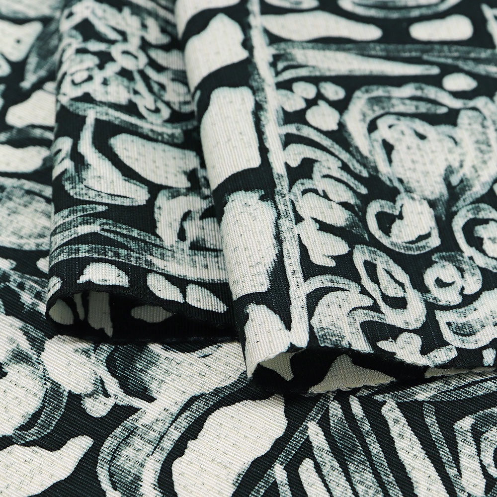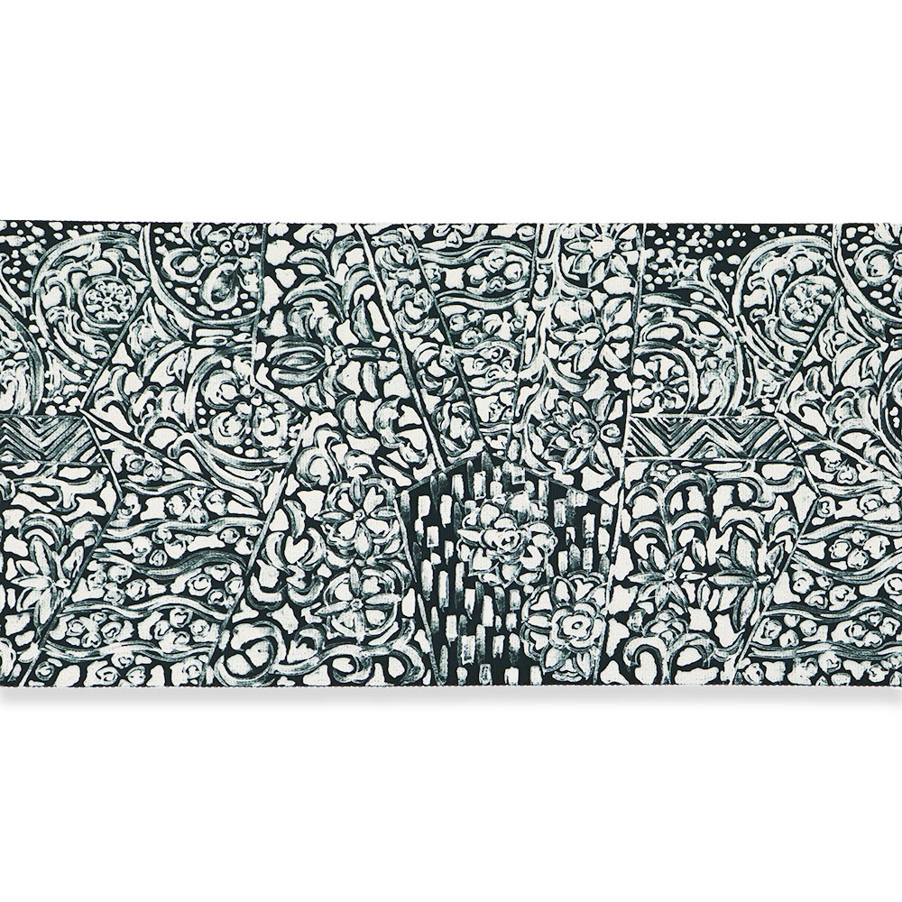 溶かした蝋で防染し染色する技法「ロウケツ染め」は、はっきりとした輪郭線と鮮やかな色彩が特徴。筆で描いたような更紗裂文は、深緑の地と白のコントラストもあいまってモードでスタイリッシュな雰囲気になっています。