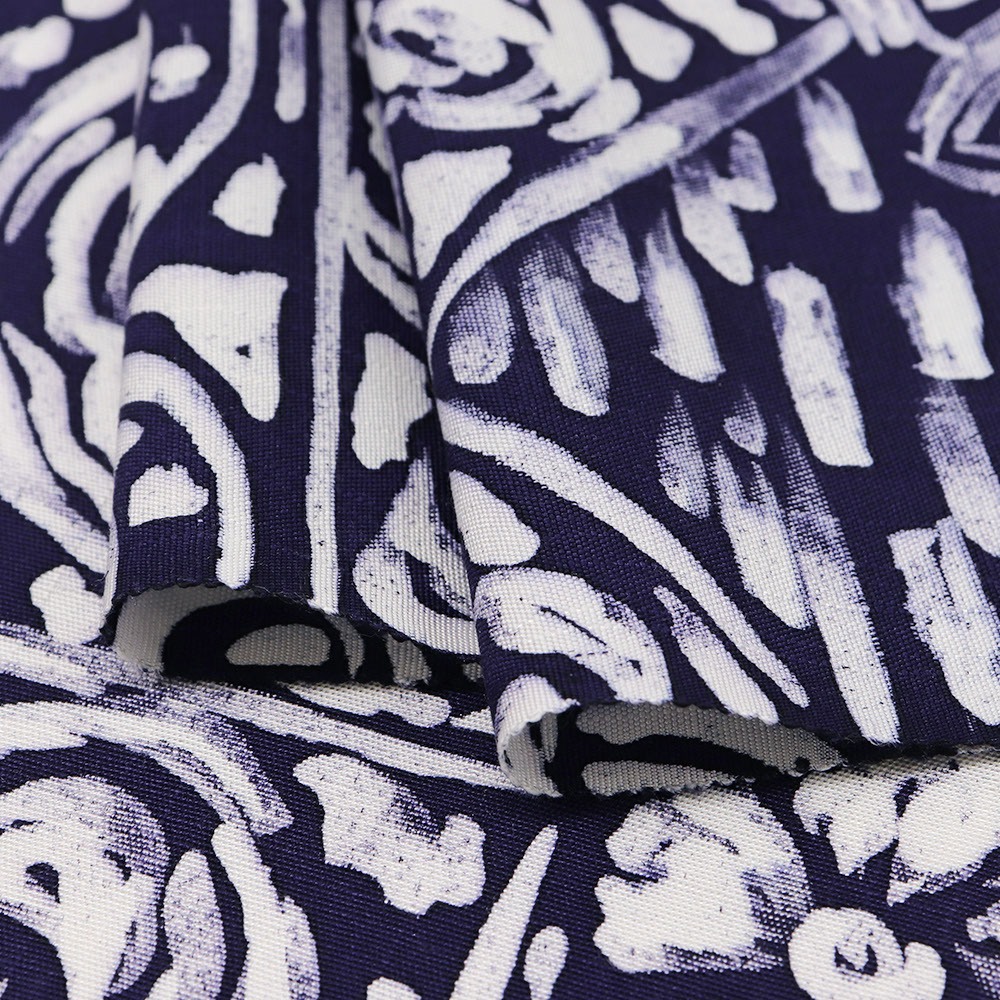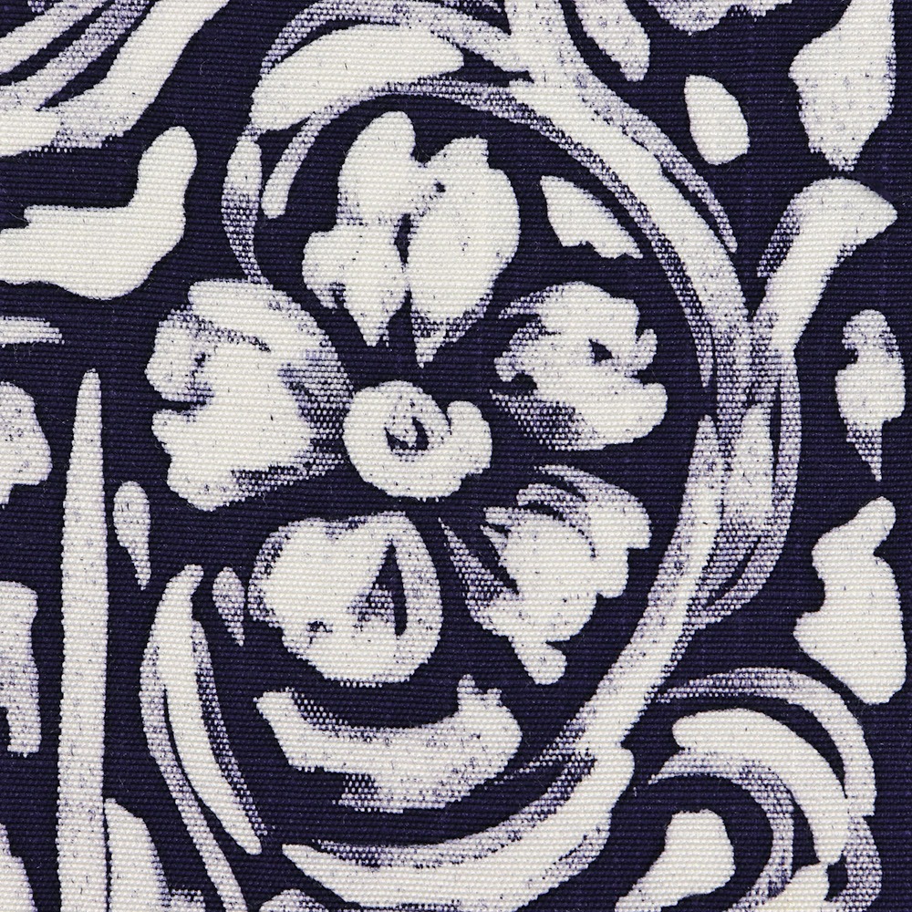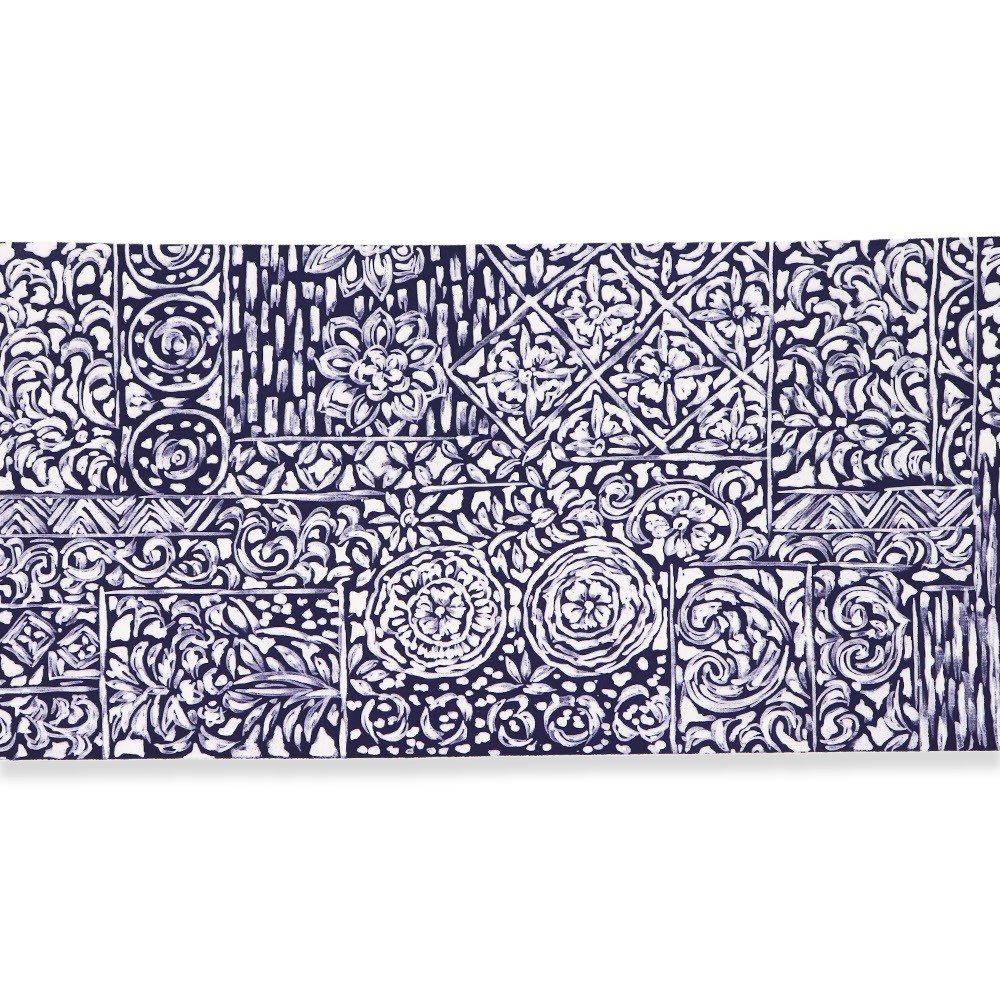 溶かした蝋で防染し染色する技法「ロウケツ染め」は、はっきりとした輪郭線と鮮やかな色彩が特徴。筆で描いたような更紗裂文は、青紫の地と白のコントラストもあいまってモードでスタイリッシュな雰囲気になっています。