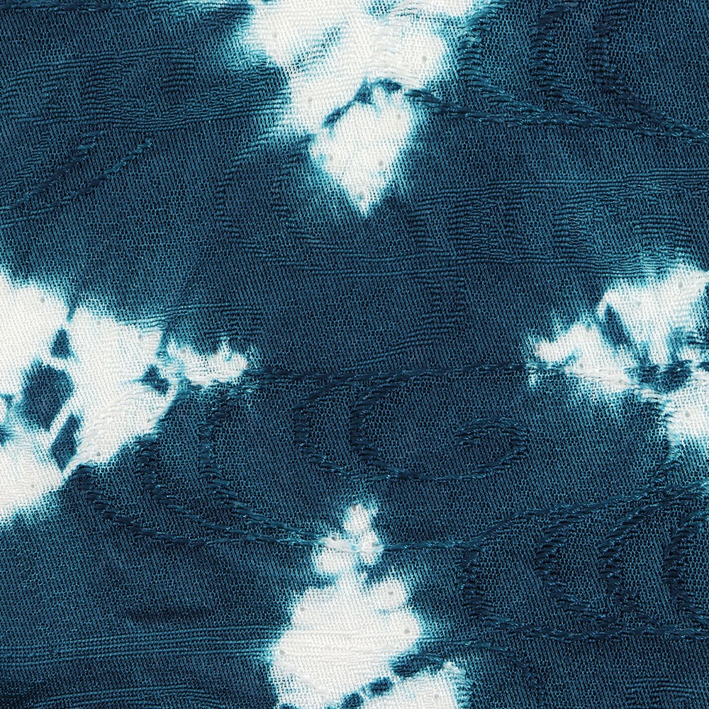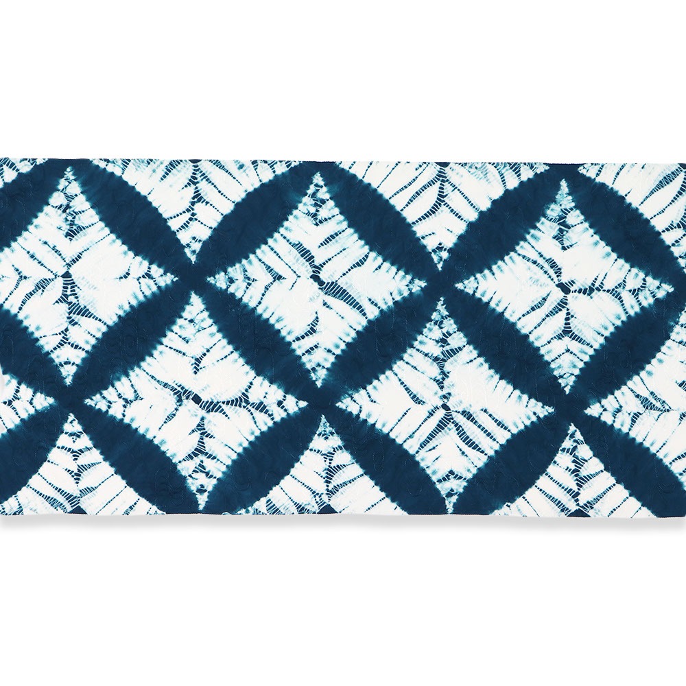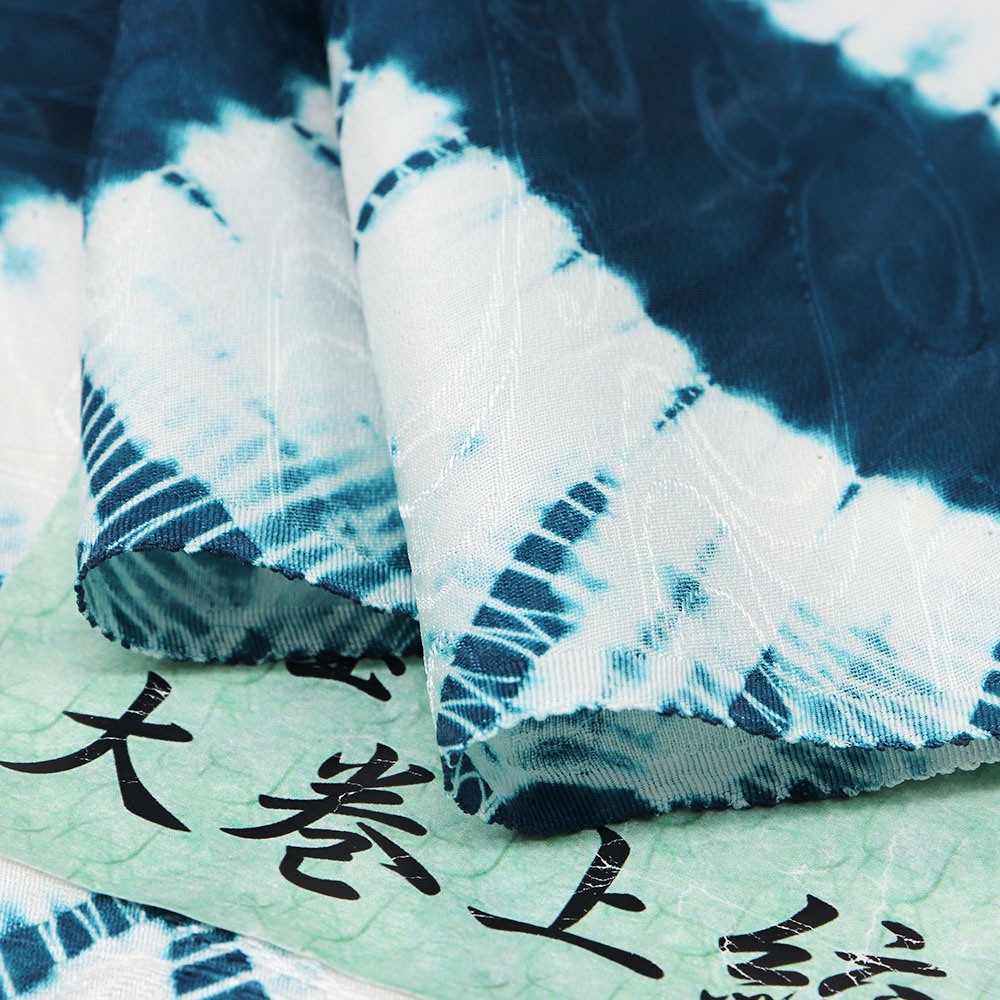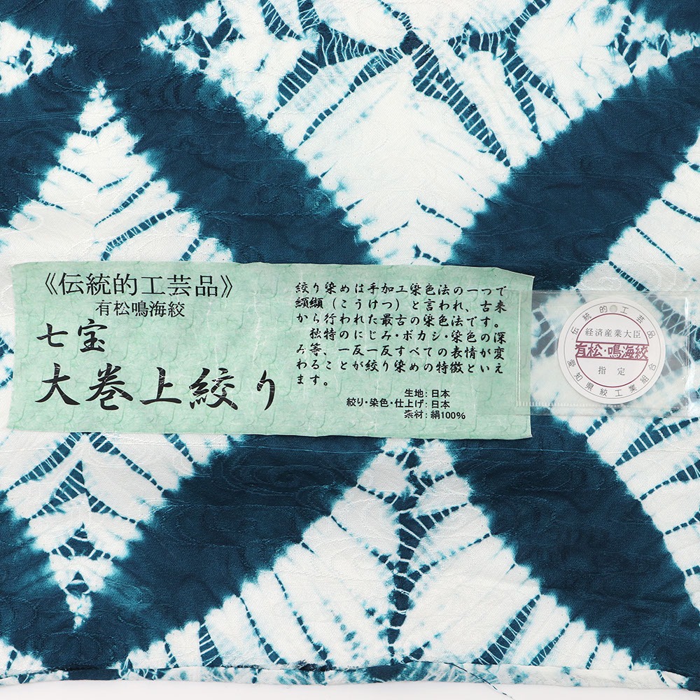 こちらは、大巻上絞りで青緑色の七宝を表現。色のにじみによって現れる濃淡も味わい深く、指定産地の職人によってひとつずつ括り染められているので、同じものはひとつとしてありません。