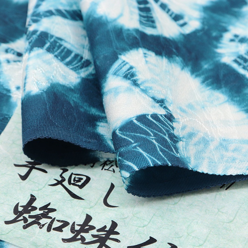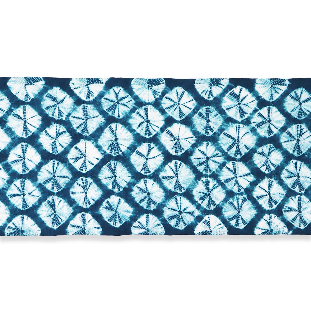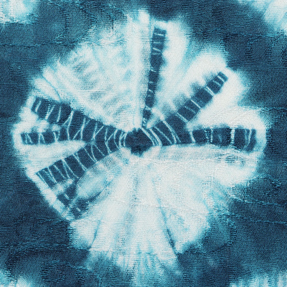 こちらは、大巻上絞りで青緑色の丸模様を表現。色のにじみによって現れる濃淡も味わい深く、指定産地の職人によってひとつずつ括り染められているので、同じものはひとつとしてありません。
