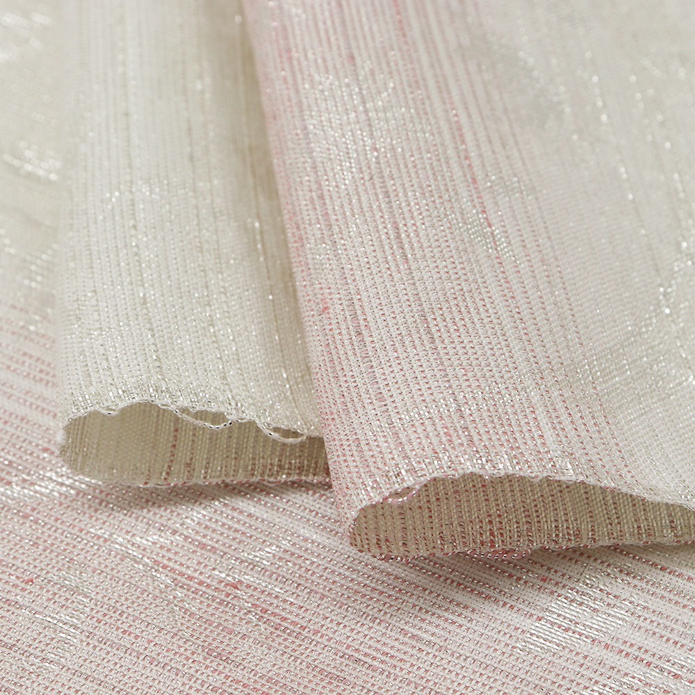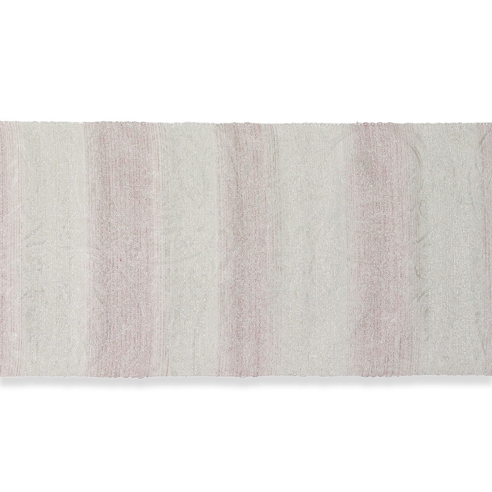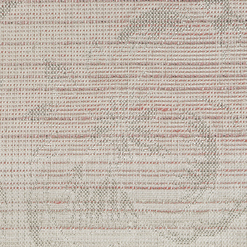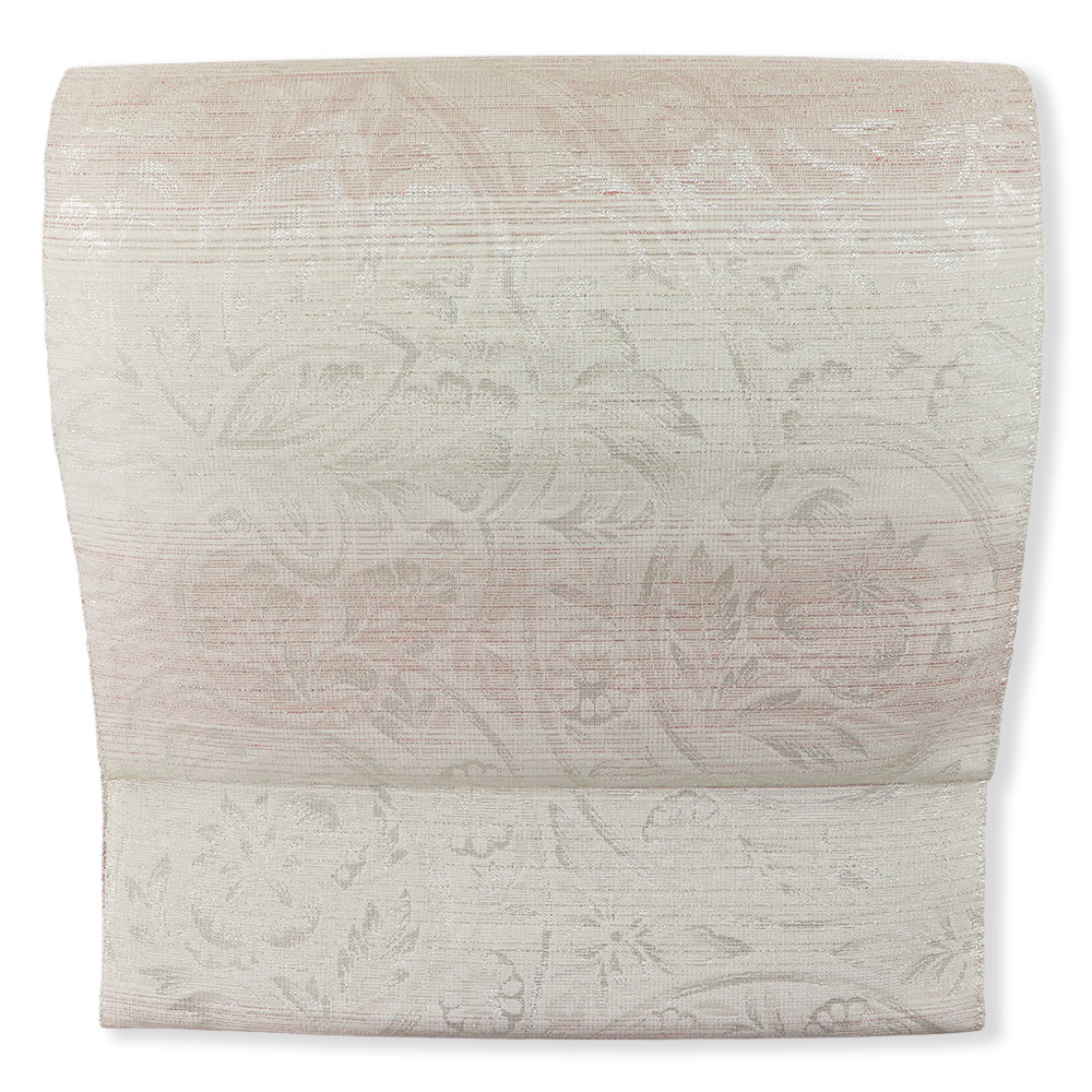 絹糸に金や銀の箔を巻き付けて織る『依金』と呼ばれる技法で織られた逸品。白と桃色で横段模様を織り出し、銀の撚糸を交えています。大きく表現された欧風更紗の柄行きも、銀の撚糸によって織り出されており、絶えない輝きが帯元を彩ってくれるでしょう。伝統的な柄行きを継承しつつ、今の時代に見合うモノつくりを目指しているという【大光織物】ならではのモダンなデザインに仕上がっています。