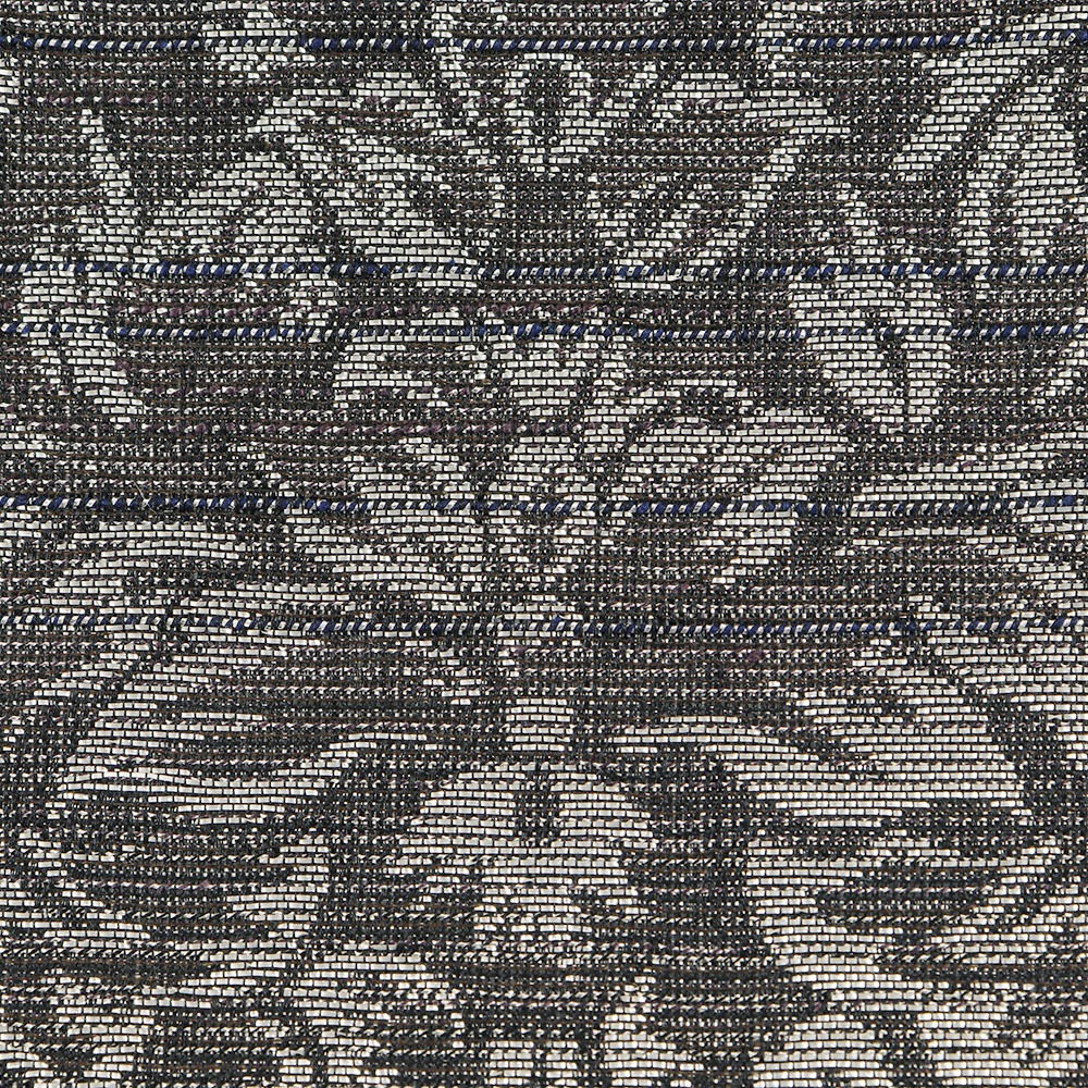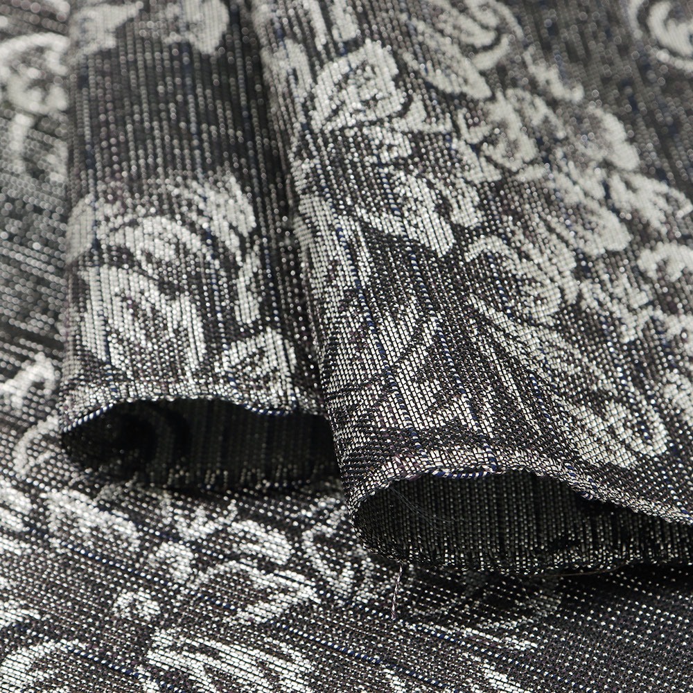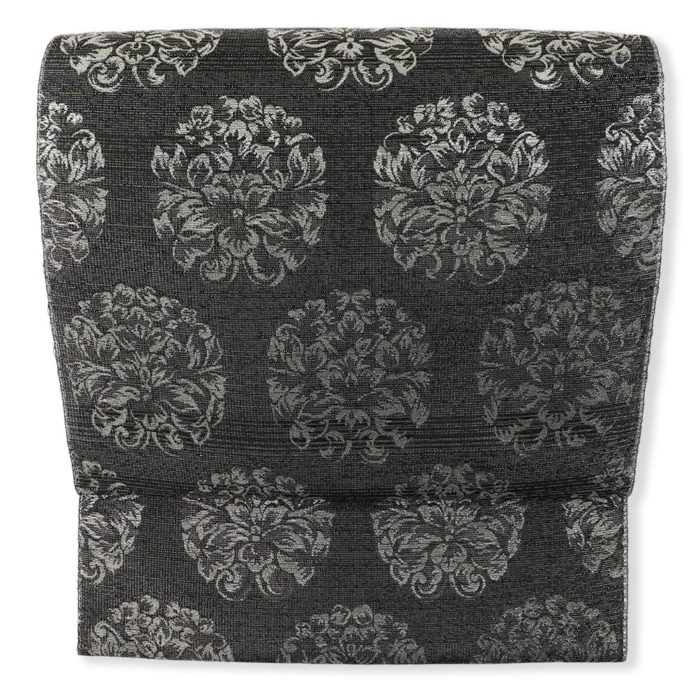 絹糸に金や銀の箔を巻き付けて織る『依金』と呼ばれる技法で織られた逸品。黒の地に銀の撚糸を交えています。華紋並べの柄行きも、銀の撚糸によって表現されており、絶えない輝きが帯元を彩ってくれるでしょう。伝統的な柄行きを継承しつつ、今の時代に見合うモノつくりを目指しているという【大光織物】ならではのモダンなデザインに仕上がっています。