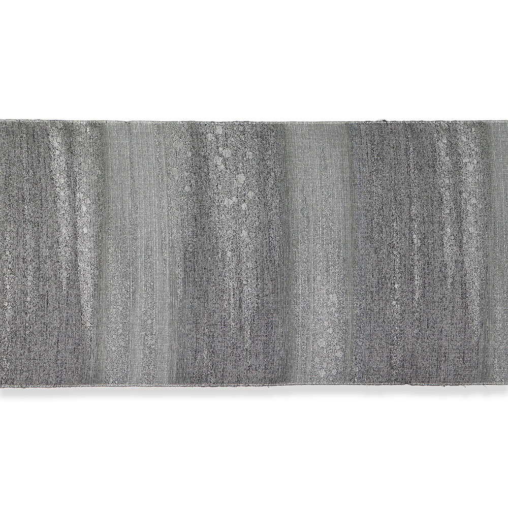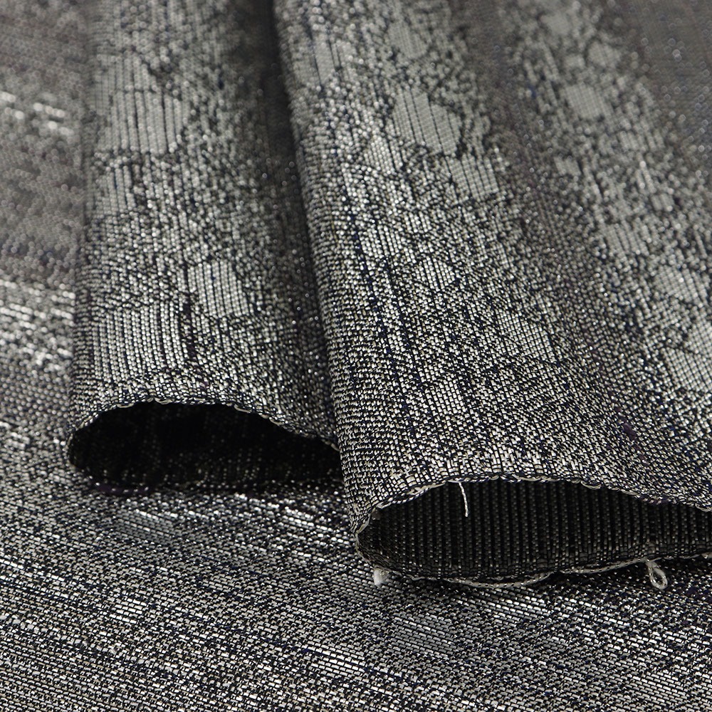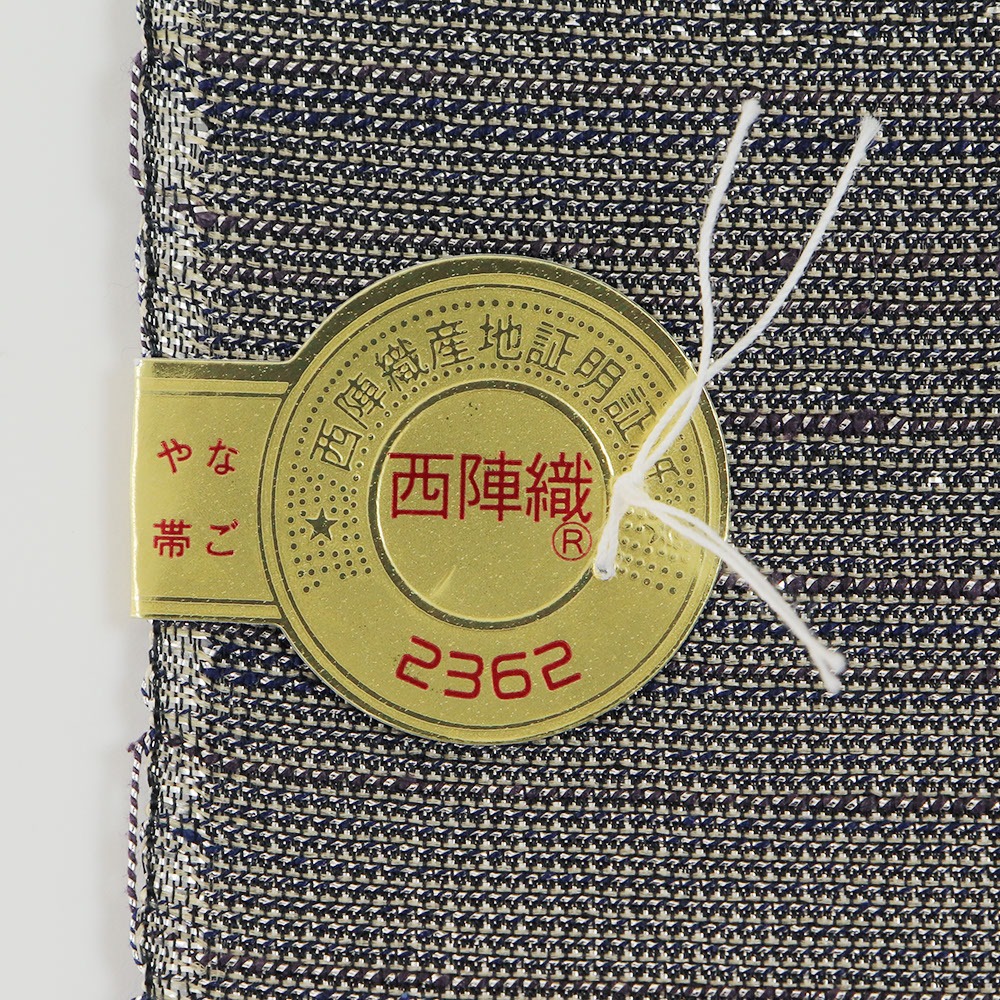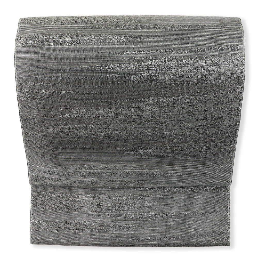 絹糸に金や銀の箔を巻き付けて織る『依金』と呼ばれる技法で織られた逸品。灰色と青色で横段模様を織り出し、銀の撚糸を交えています。細やかな幾何模様の柄行きも、銀の撚糸によって織り出されており、絶えない輝きが帯元を彩ってくれるでしょう。伝統的な柄行きを継承しつつ、今の時代に見合うモノつくりを目指しているという【大光織物】ならではのモダンなデザインに仕上がっています。