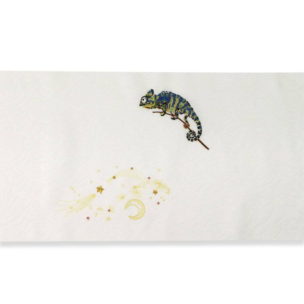 空の星を狙うカメレオンを刺繍した一本。カメレオンの鮮やかな色彩を忠実に表現したデザイン性の高い仕上がりです。お太鼓では頑張って舌を伸ばしているカメレオンですが、腹前ではお澄まし顔なのが微笑ましいですね♪